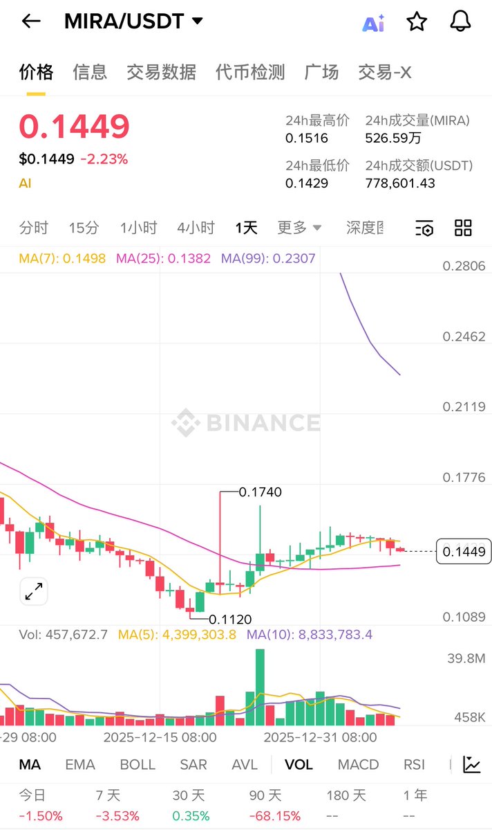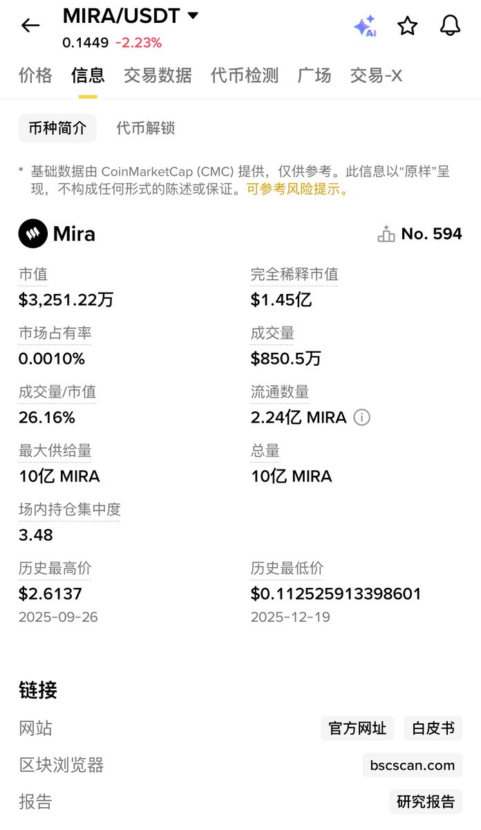 今天朋友来问baby,为啥 $MIRA 跌了这么多,你还在建设!baby来谈谈 $MIRA 实用不涨价的核心矛盾(仅代表个人观点) 我就问你是不是懵了?MIRA明明超能打 ①AI《靠谱检查员》450万用户的②Klok App靠它日验30亿次 ③DeFi交易零错、医疗诊断准96%,④TVL早破1亿刀,怎么从TGE $2.6跌到$0.34 baby认为跌跌不休3个元凶 ①卖压大:11月解锁1.4亿$MIRA(流通量+68%)!早期投资人和团队开始套现,加上Yap奖励缩水 ②​大环境冻僵了:2025 AI热退潮,比特币牛里大家都躲风险,美中科技关税一炸,TAO/FET都跌20% $MIRA FDV 1.4亿刀被说贵,薄流动性把跌幅放大 ​ ③情绪有点慌:推特上有人喊奖励缩水,要破底,虽说社区认MIRA是AI基石,但新落地的dApp还在攒用户像刚开的好超市,顾客没全来 反弹希望还有吗? 短期:RSI跌到25(超卖!低于30就是底部信号),昨天已反弹8%!守住$0.31底,就能冲$0.46,11月解锁前是卖压峰值,熬过去就松 ​ 中期:Q1上Solana桥、Q2开代理市场,TVL有希望冲50亿 ​ 长期:年底稳在$0.32-$0.57,2026有望破$0.56+鲸鱼早开始偷偷攒,社区都喊这是TAO 2.0,baby认为这是低吸机会 如果你和baby一样看好mira不妨来质押 币安直接买现货,价格在$0.34,连Base链,押进Prime池,能赚12-18% APY,具体教程官网查看https://t.co/iNWgy3HTCJ @Mira_Network @MiraNetworkCN