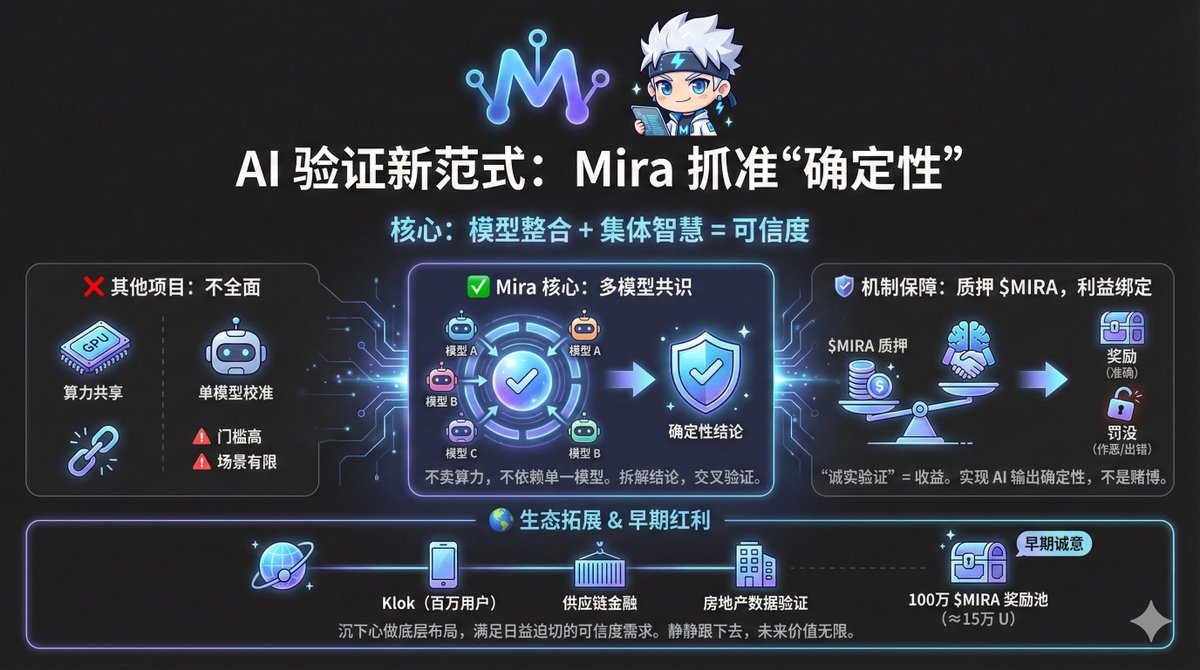 现在其实做 AI 验证的项目不少的,但是都不全面,有的侧重算力共享,有的盯着单模型校准,但实际用下来要么门槛高,要么覆盖场景有限 最近梳理 Mira @miranetwork的进展的时候,发现它的差异化就体现出来了,主要的核心就是抓准了 “确定性”。 Mira 和其他项目不一样,它不卖算力,也不依赖单一模型,而是做模型整合 —— 相当于把多个主流大模型凑到一起,用集体智慧解决可信度问题。 AI 输出的每个结论,都会被拆解后让这些模型交叉验证,不是某一个模型说了算,得大家达成共识才算数 为了让验证靠谱,验证节点得质押 $MIRA 才能参与,判断准确能拿奖励,作恶或出错就会被罚没代币,这种机制把 “诚实验证” 和利益绑在一起,真正实现了 AI 输出的确定性,不是赌模型没幻觉 团队现在也在聚焦可信 AI 赛道,不发散叙事,除了已经有百万用户的 Klok,生态还在往供应链金融、房地产数据验证这些现实场景拓展 之前说的 100 万枚 $MIRA 奖励池,按当前 0.15的价格,大概 15万 U 的规模,能看出项目方对早期参与者的诚意了 在一堆卷模型参数、炒算力概念的项目里,Mira 沉下心做模型整合和确定性验证的路子,显得就很真实 AI 行业越发展,对可信度的需求越迫切,这种差异化的底层布局,未来价值应该会越来越明显,静静的跟下去就好了 #Mira #AI