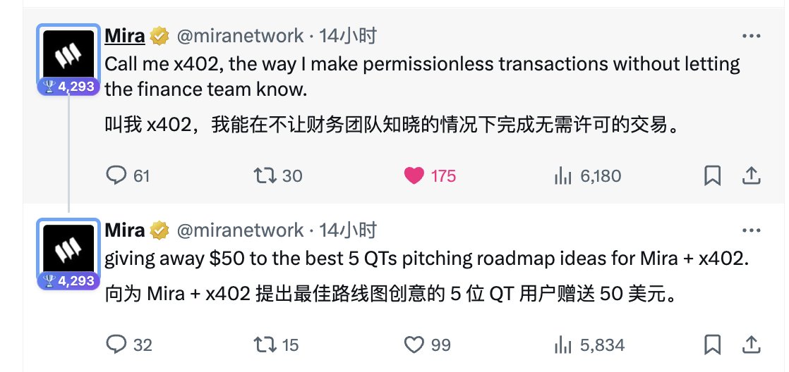 币安是真的对我们用户太好了,这次MMT打新0.1单价给到我们用户,太良心了,这样的币安,用户怎能不爱 今天来聊聊Mira和x402,可以说简单到离谱,却又必须得承认牛得不行 支付(x402)+验证(Mira)+经济($MIRA) x402是AI场景的支付协议升级,核心是激活HTTP协议中沉睡30年的402状态码,为网站、AI服务构建请求即支付能力,支持AI代理自动化微支付,实现支付-内容解锁无缝衔接 x402流程:AI代理发起请求→服务端返回402支付指令→代理以USDC等稳定币完成无签名自动化支付→内容解锁 核心优势:规避传统支付的KYC繁琐性与Crypto支付的Gas成本,实现了HTTP层机器间免人工干预的高频微支付 Mira核心定位:去中心化AI验证平台,通过区块链+多模型共识,解决AI幻觉问题,输出结果需达预设共识率方可生成验证证书 节点机制:节点质押$MIRA参与验证,错罚对赚,主网上线1月用户达450万,日验证30亿token,与irys合作实现低成本链上存证 核心价值:为AI输出提供可追溯验证凭证,典型场景如DeFi机器人交易前风险核查,规避盲信风险 与x402协同:x402负责支付-内容获取闭环,Mira保障内容真实性, $MIRA 为生态经济载体,可支持AI生成内容的自动扣费+原创验证,推动按像素付费模式落地 Mira和x402合作意义: x402激活老HTTP码,让AI收微支付不用KYC、gas费,Mira靠多模型投票防AI瞎编,还存链上。现在大公司都在用,以后AI可能按次收费还靠谱,就是得调投票比例、等浏览器支持,但确实解决了真问题 @miranetwork @MiraNetworkCN @irys_xyz