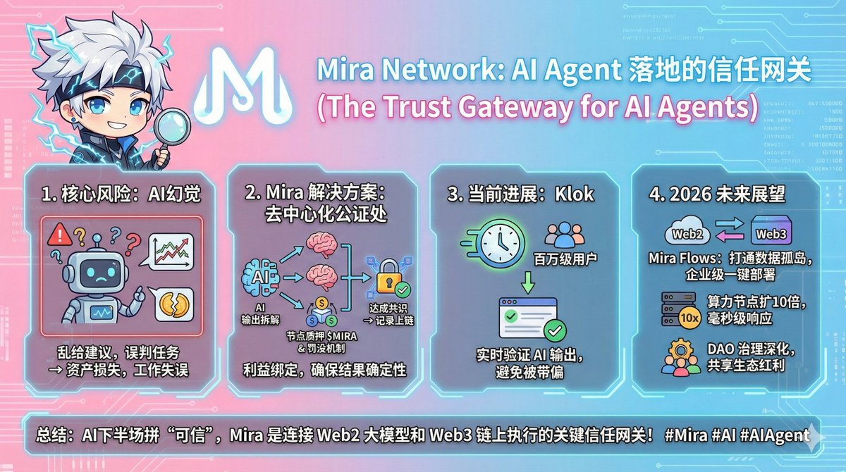 前两天和朋友打语音聊到 AI Agent 落地,都在说它能帮着处理链上交易、代做工作任务,却很少有人提最核心的风险 这智能代理要是犯 “幻觉”,乱给交易建议或误判任务,造成的损失谁来扛?毕竟涉及资产和实际工作,光聪明没用,毕竟靠谱才是底线 然后我就给朋友说,你是不是忽略了一个项目,米粒@miranetwork刚好就是解决这个问题的,它不做更牛的 AI 模型了,而是定位成 AI 的 “去中心化公证处” 和其他验证项目不同,它走的是模型整合的路子:把 AI 输出拆解成一个个可验证的点,丢给多个不同大模型和节点交叉验证,只有达成共识的结果,才会被记录上链 为了让验证靠谱,节点还得质押 $MIRA 才能参与,要是判断出错或者作恶,质押的代币就会被罚没,这种利益绑定的方式,才让验证结果有了真正确定性。 它也不是只停留在叙事阶段,已经上线的 Klok 吸引了百万级用户,能实时验证 AI 输出,避免大家被看似合理的错误回答带偏 2026 年的方向也很清晰,从基建搭建转向生态爆发:Mira Flows 要打通 Web2 和 Web3 的数据孤岛,让企业级 AI 应用一键部署; 算力节点规模预计扩 10 倍,实现毫秒级响应;DAO 治理也会深化,让开发者和节点贡献者共享生态红利 现在 AI 上半场拼参数,下半场拼的是 “谁更可信”,Mira 刚好踩中这个生态位 它就像 Web2 大模型和 Web3 链上执行之间的信任网关,解决了 AI Agent 落地的关键卡点,这也是我持续跟踪它的核心原因,期待后续的更多进展了! #Mira #AI #AIAgent
