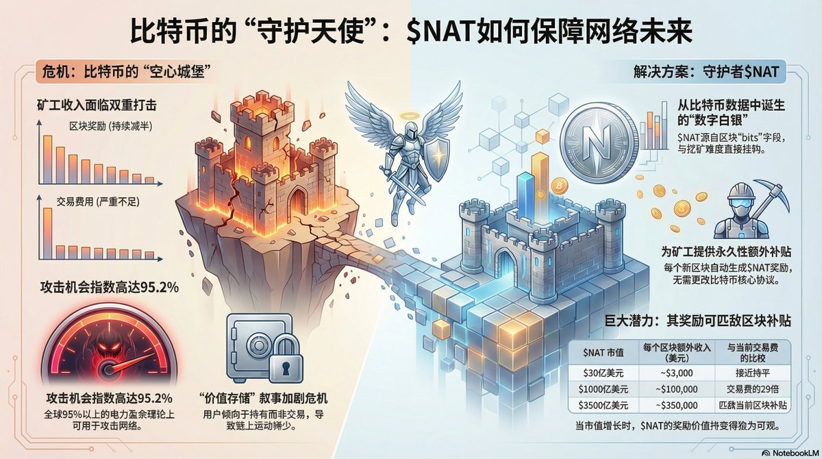 【 $NAT :比特币的未来守护者,不可错过的数字黄金衍生品 🚀】 1⃣比特币面临的危机:空城堡效应 玩家们有没有留意到一个有趣的现象,比特币区块链上最近出现的空块越来越多。 这并不是一个巧合,而是比特币成功的“副作用”: 👉各国政府将比特币作为储备资产/没收资产长期持有; 👉华尔街通过ETF大量购买却从不触碰链上; 👉投资者被教导"HODL"而非使用比特币 👉BTC被认为就是黄金,不需要建设生态 简单说:比特币正在成为一座价值连城却几乎无人居住的宏伟城堡。2万亿美金的链上房地产,相当于黄金全球市值的十分之一。 2️⃣矿工的困境:谁来支付安全费用? 比特币网络整体安全依赖矿工们,但目前他们面临双重打击: 👉区块奖励不断减半:从最初50枚→现在3.125枚→未来将降至零 👉交易费用不足:当人们只持有不交易,费用从何而来? 这就像要求职业保安团队免费守护金库? 3⃣ $NAT :比特币的守护天使 优雅而巧妙的解决方案诞生了—— 数字物质理论(DMT)应运而生,其首个实现就是 $NAT(非任意代币),它的设计异常创新:这个字段代表 👉 利用比特币区块中一个名为"bits"的字段创建价值,("bits"是每2016个区块(约两星期)调整一次的挖矿难度),目前该值约为3.86亿。 👉每当矿工挖出一个区块,自动生成$NAT代币 👉即使区块内没有交易,矿工也能获得这份收入 $NAT可以理解为就是比特币数据矿山中自然伴生的贵金属(非人为控制数量,伴随区块数据一起生成),为矿工提供额外回报,确保他们能够继续守护网络。 更多关于$NAT的详细信息过往介绍:👇 《XX是个什么鬼系列二—— $NAT/加强版 》 https://t.co/8d0RFn6DST https://t.co/dETEcof2Pt… 4⃣ $NAT 的惊人潜力——比特币的“数字白银” 如果比特币是“数字黄金”,那么NAT就是“数字白银”。它不仅为矿工提供收益,还为比特币生态系统注入了新的活力,推动比特币从“价值存储”向“多功能平台”转型。 👉市场潜力:随着比特币生态的扩展, $NAT 的价值也有望大幅增长。 👉社区支持: $NAT 已经吸引了大量社区成员,未来将推动更多创新与应用。 👉全球共识: $NAT 的机制为比特币网络提供了可持续性,可能吸引更多国家、机构和个人参与。 目前 $NAT 市值约900万美元,持有者已达23,000名,但其潜力远未被充分发掘: 👉以当前市值,矿工Foundry在三周内已经获得了约16.6万美元的$NAT 👉若市值达10亿美元,每个区块可为矿工提供约1000美元收入 👉若达到30亿美元市值,$NAT收入将与当前比特币交易费相当 👉若达到250亿美元(与Dogecoin相当),Foundry三周内可获得4500万美元 5⃣ 比特币与 $NAT :完美共生 $NAT 不是来挑战比特币,而是来完善它: 👉随着比特币被更多国家和机构纳入储备资产,链上活动可能进一步减少。 👉非人为设计: 不改变比特币核心协议,$NAT 的供应由比特币网络本身的物理特性决定,完全非任意非人为; 👉永续激励机制:不依赖外部补贴,即使在比特币全部开采完毕后, $NAT 仍能激励矿工; 👉生态系统建设:$NAT鼓励开发者在比特币上构建应用,增加链上活动,带来交易和交互费用; 6⃣参与$NAT生态系统 玩家不仅仅是持有一种代币,更是帮助比特币网络的长期可持续发展。 为了比特币能够长期生存和繁荣,它必须超越仅仅作为价值储存的功能,需要真正的实用性,也需要足够的链上活动。比如1 层上的智能合约:交换、借贷、权益证明协议等,比如基于身份的社交/ordinals NFT/元宇宙等等 BTC生态/元宇宙也需要一个统一的交互和激励货币媒介,不可能生态内每个项目都像ETH生态那样,复杂的单独融资、发行、运营,完全脱离了BTC极致的简约美。 当比特币真正成为全球储备资产,市值达到20万亿美元时, $NAT 会确保这座数字城堡永远坚不可摧。 而这一切并不需要花费巨额资金,只需要一点远见、信念和持有一些 $NAT 。 附常用工具传送门 $NAT 区块浏览: https://t.co/FcTVL2l8uU $NAT交易平台: https://t.co/udjyaJgLZl $NAT 交易DEX: https://t.co/p3mIx7kPnL
