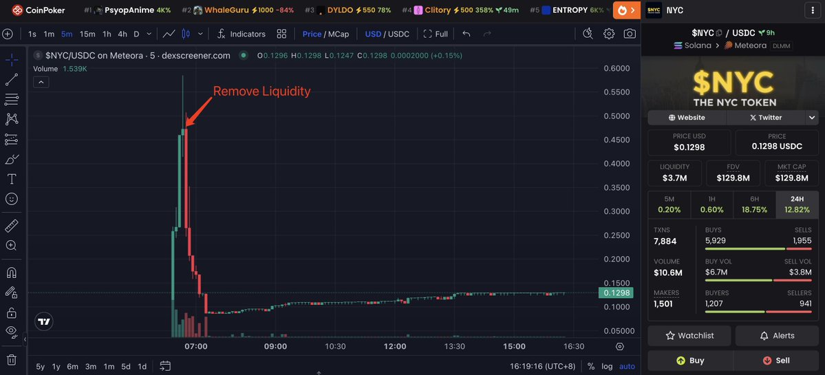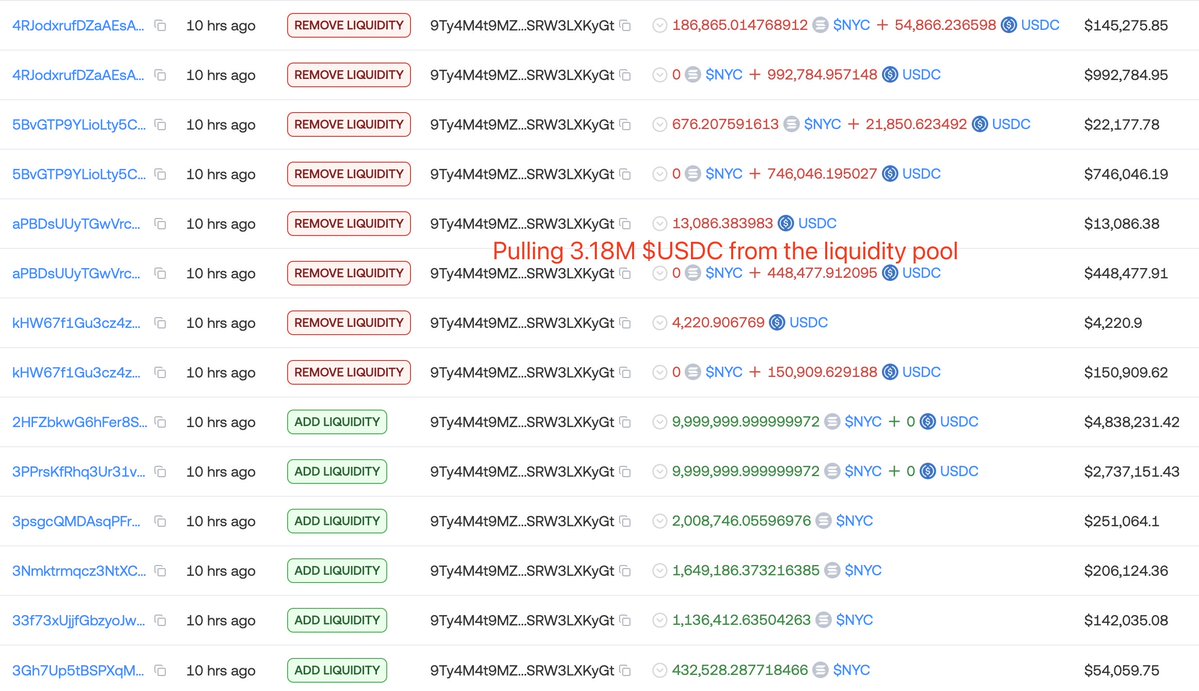 Eric Adams(@ericadamsfornyc), the former mayor of New York City, launched a memecoin $NYC and removed liquidity at the price peak, pulling 3.18M $USDC from the liquidity pool.