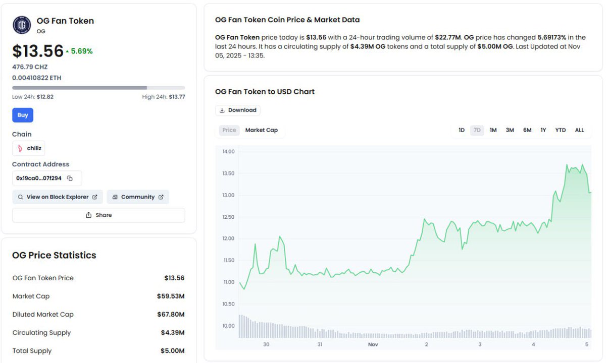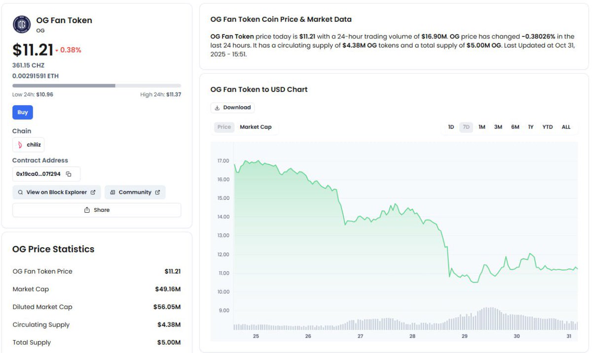 Seeing some solid opportunities in this dip 👀 Watching @FanTokens closely and $OG stands out. 51% was recently acquired by Chiliz, and this token has already hit $100M+ before. Strong fundamentals, real backing, and fresh momentum building. I’m adding here because I think we might see some action soon 📈 Check it here: https://t.co/XTqSskgBb4