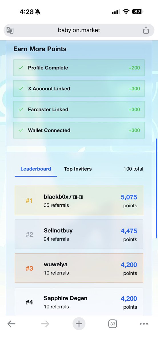 完了忘了... 再也沒有隱私可言 之前這個是可以自己設置的 現在就直接裸奔暴漏在聚光燈下了😂 順帶分享一個 alpha 項目 按頭速沖! @PlayBabylon 是 Shaw(ai16z、ElizaOS 的那位)發起,背景很強的那種。 現在開放 WL,記得提前去卡個位 https://t.co/PIGXTbNrxs 登入方式有三種:用 @farcaster_xyz@gmail 或錢包就能進去。 PS:進去記得把推特授權給鏈接一下,會有額外的 300 的積分獎勵。