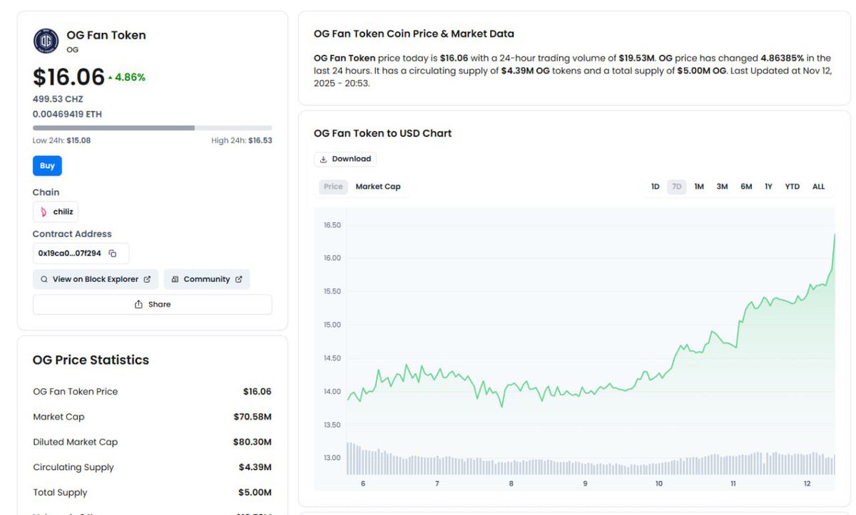 $OG is bouncing hard this week. Up +18% in the last 7 days and showing serious strength. Back in September it was trading 2x from here… and the chart looks like it wants to go for that retest soon. I’m expecting a push into year end so I’m jumping in on this setup. Check @Fantokens here: https://t.co/XTqSskgBb4