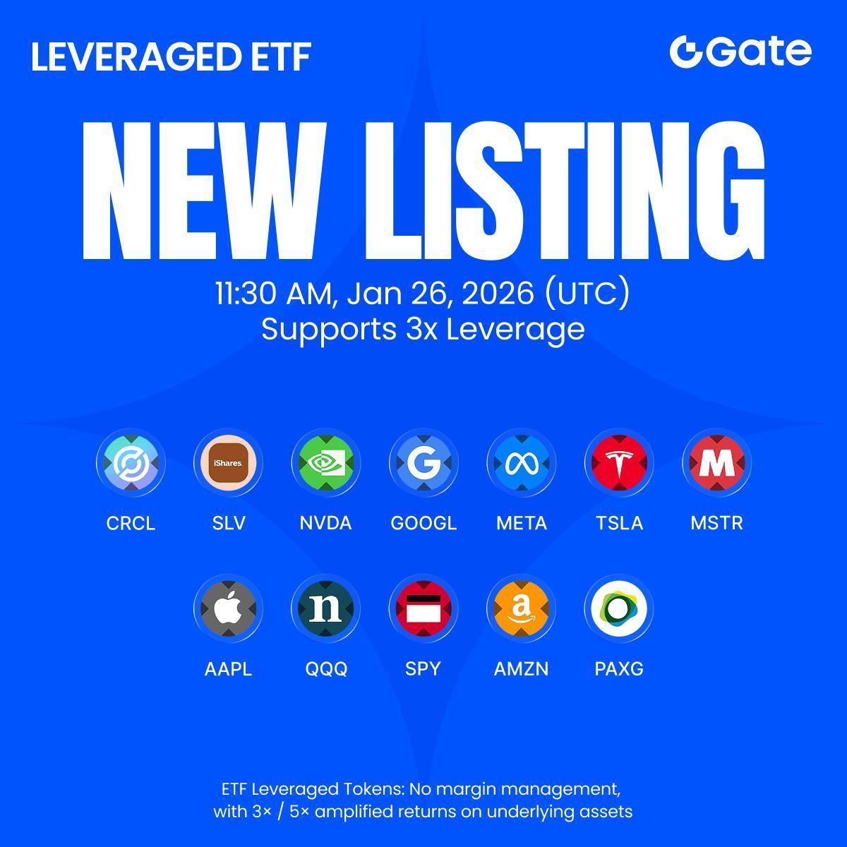 Go 3x long or short on $CRCLX, $SLVON, $NVDAX, $GOOGLX, $METAX, $TSLAX, $MSTRX, $AAPLX, $QQQX, $SPYX, $AMZNX, $PAXG with new ETF Leveraged Tokens. Trade on Gate with leverage and greater flexibility. Trading Starts: Now Open Details: