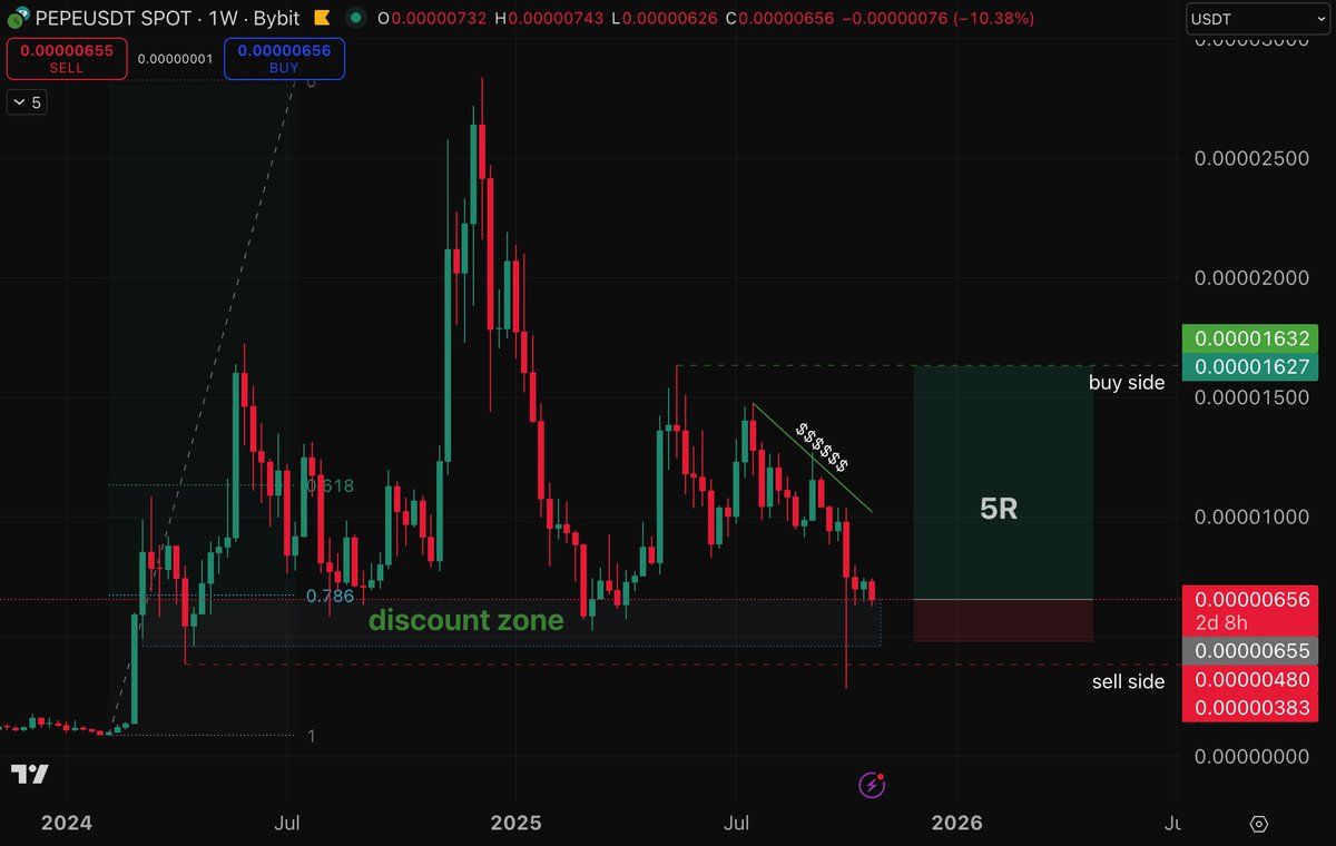$PEPE in discount zone right now, it's a solid spot play imo. Sell-side liquidity has been tapped, and all leveraged longs flushed. The reversal will be televised.