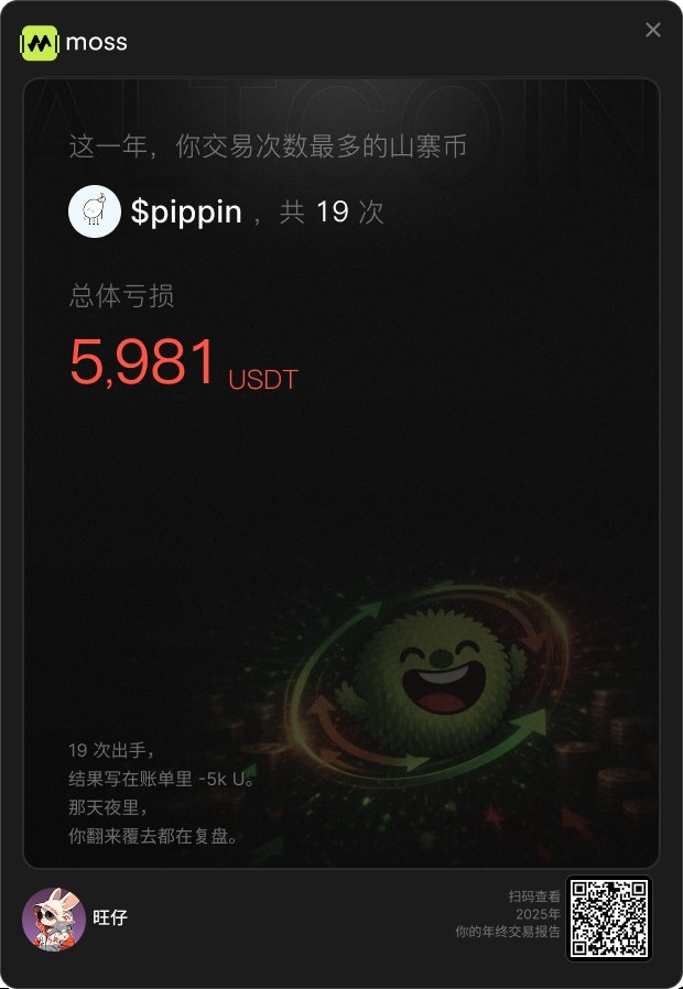 用 @MossAI_Official 生成了一下年报,不看不知道,一看吓一跳,我说钱包里的U都去哪了,原来就 $pippin 这一个币就亏了差不多6000刀,还有天理吗?还有法律吗?