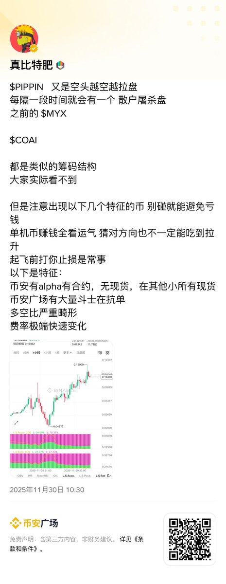 昨晚川子赦免了CZ,这个算是大利好了,算是政策上再次倾斜币市,期待后面储备计划的细节,这个是今年能否再冲15w的决定因素。行情上今天是普涨状态,但是和cz相关的币飞得更猛,bnb直接暴涨5%,4之类的meme也飞了,$aster 涨了10%,有人预测cz会拉盘wlfi以表示感谢,现在已经飞了,另外就是币安合约的妖币,$coai新高了,fdv冲到了220亿,这个控盘真的绝,币安合约板块又不少单日翻倍的,$apr $pippin 等等,这些都有成为下一个coai和myx的可能,现在现货、alpha+合约已经严重分化,资金更聚焦新币和强控盘的币;今早stable 开通首批存款8.25亿,直接被科学家和机构包场了,重现当年xpl的盛况,预期后面会出来一个比xpl更大的项目,关注后续新池子的开放吧,这市场还是钱多,只是缺好的叙事而已。