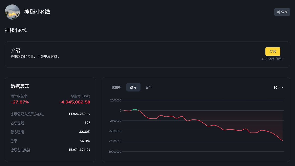 目前「神秘小 K 线」的币安合约实盘面板显示已累计亏损 494.5 万美元,近一个月的收益曲线一路向下:https://t.co/AIHM5XBjq8
