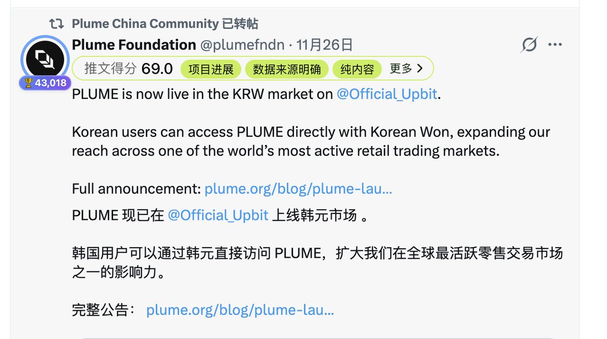 10.11之后发现很多项目方都摆烂了,但plume.一直在默默的做事,管理1370亿美元资产的资产管理公司将14只不同类型的基金投放至 @plumenetwork平台!其中一只基金的基本年化收益率高达11%,这个年化收益不管在哪都算是佼佼者了,圈外资金通过RWA在逐渐的进入币圈 $plume 就是冉冉升起的明星。