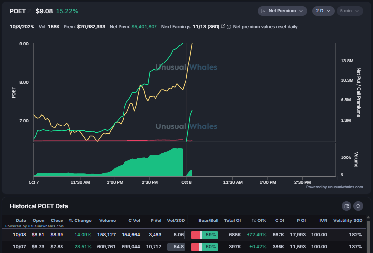 $POET saw a massive move today, and the flow found on Unusual Whales yesterday gave us the inside edge that something unusual was brewing.