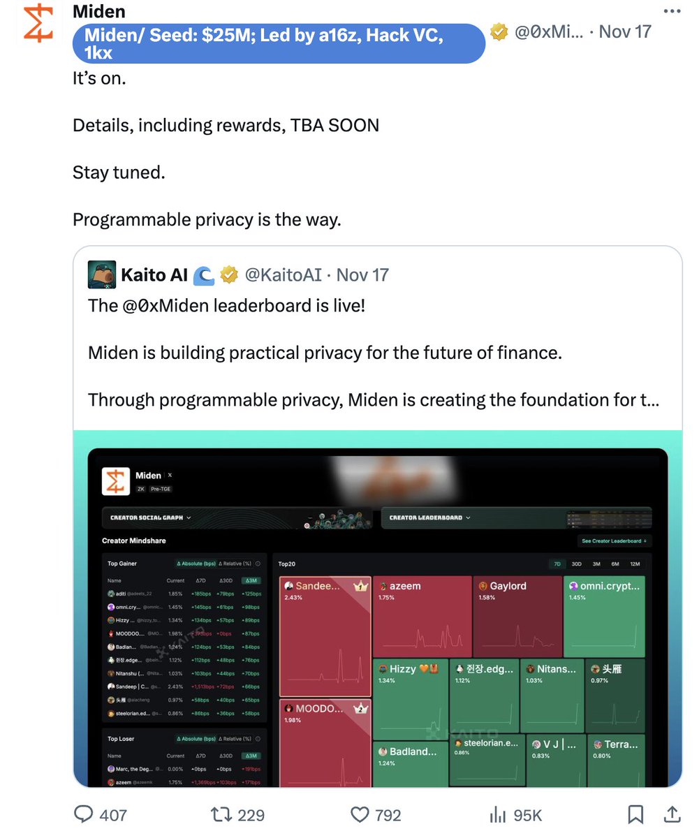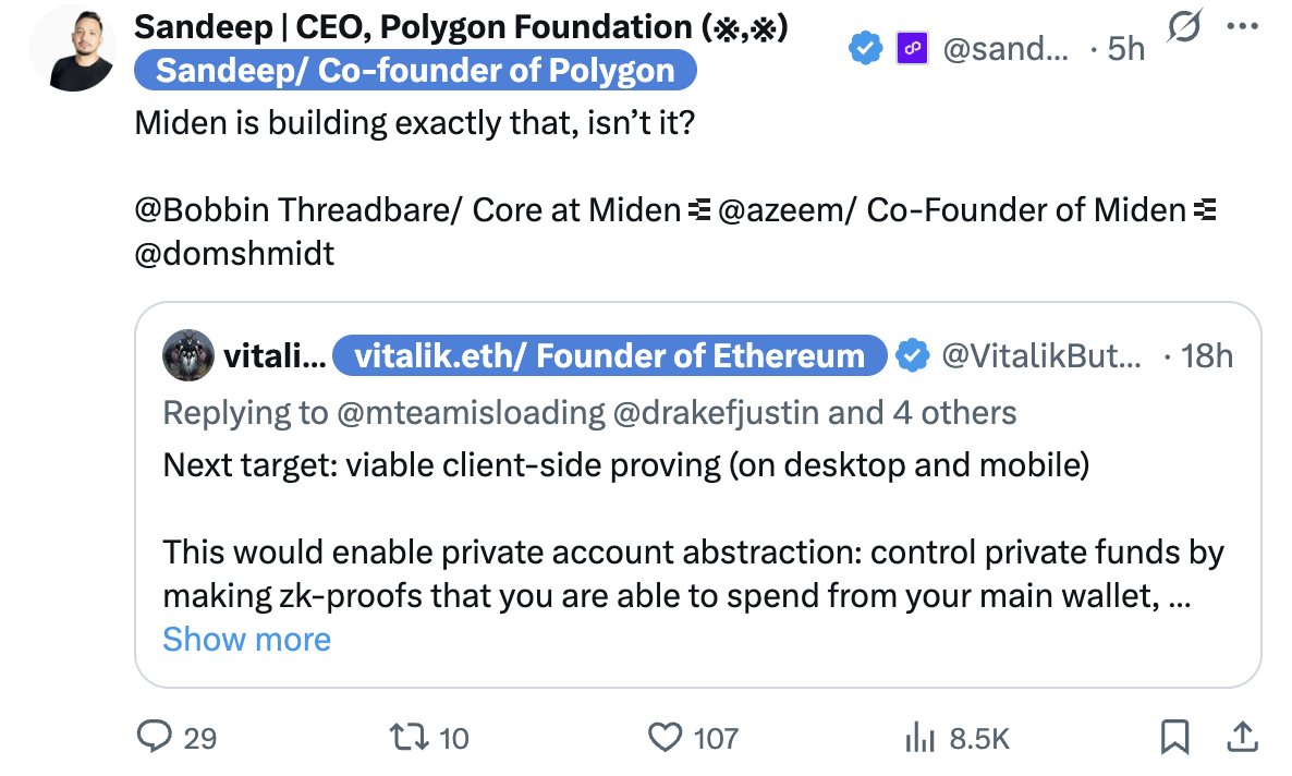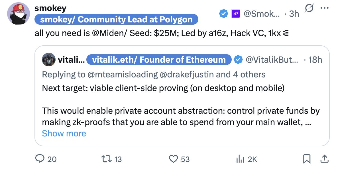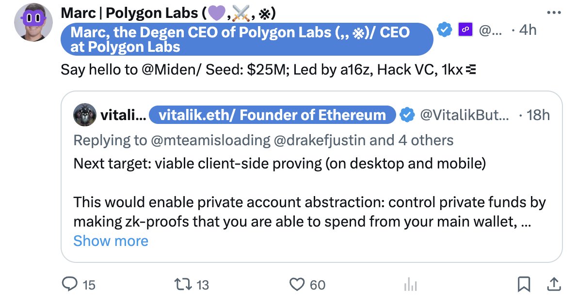 Polygon 核心团队的人在不遗余力地shill @0xMiden .