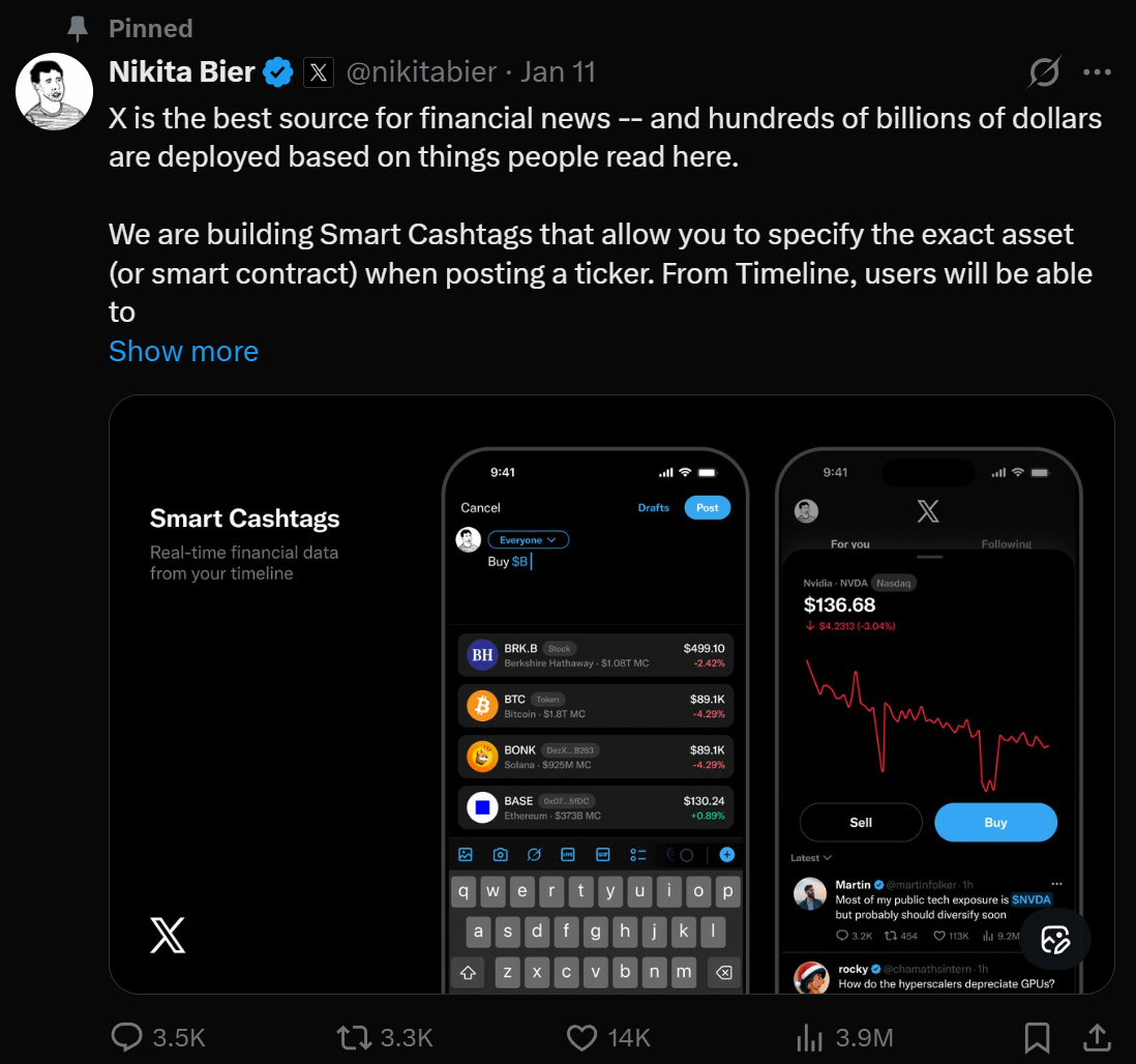 逻辑角度,目前X月活跃用户约5.61 亿,一旦用户习惯“点击代币名 → 看数据 → 看讨论 → 跳转交易”,X 就从社交媒体变成了全球最大的“链上金融的操作系统”,预估每月可能爆发出上百亿的交易量!