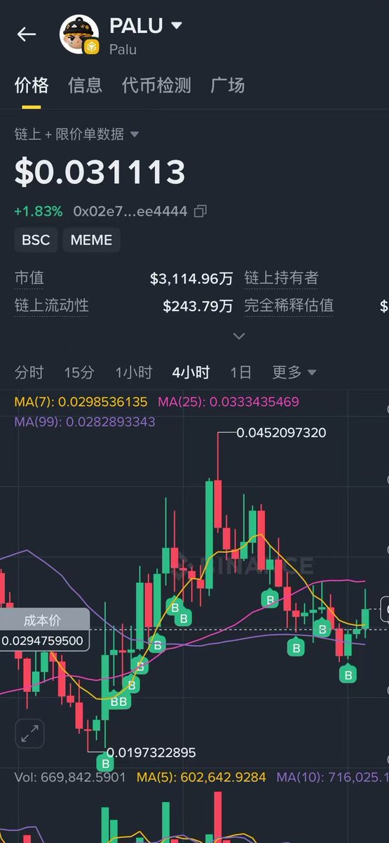 3⃣昨天力推的 $Palu 也开始涨了,目前市值来到了3200万附近,昨天跟着上车的也盈利快20%了,继续持有