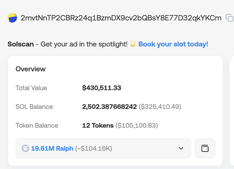 The $RALPH dev dumped 7.68M $RALPH for 1,888 $SOL($245K). And the $RALPH market cap has crashed from $50M+ to $5M. Notably, his other wallet, 2mvtNn, still holds 19.61M $RALPH($104K).