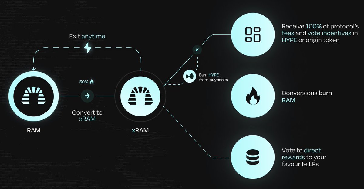 🔸治理与投票更灵活: $xRAM 持有者可手动投票引导排放(或设为铸造成 $hyperRAM, 通过 x(3,3) 机制自动投票与复投),赚取交易手续费 + 投票奖励。质押者还能从每笔交易中自动赚取 $HYPE ,收益更可预测。