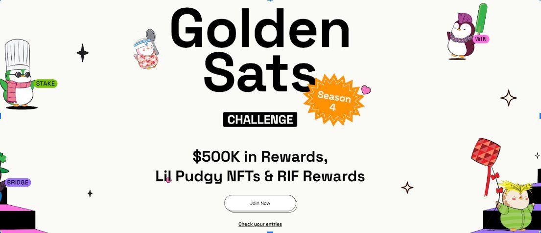 The fourth and final season of the Golden Sats Challenge just dropped 💥 Win one of two @LilPudgys NFTs, $RIF token rewards, and boost your chances with a ticket multiplier 🎟️ Bitcoin DeFi at its best. Don't miss it! Join now 👉