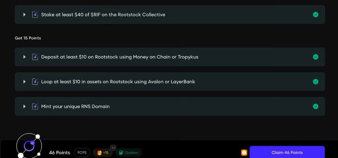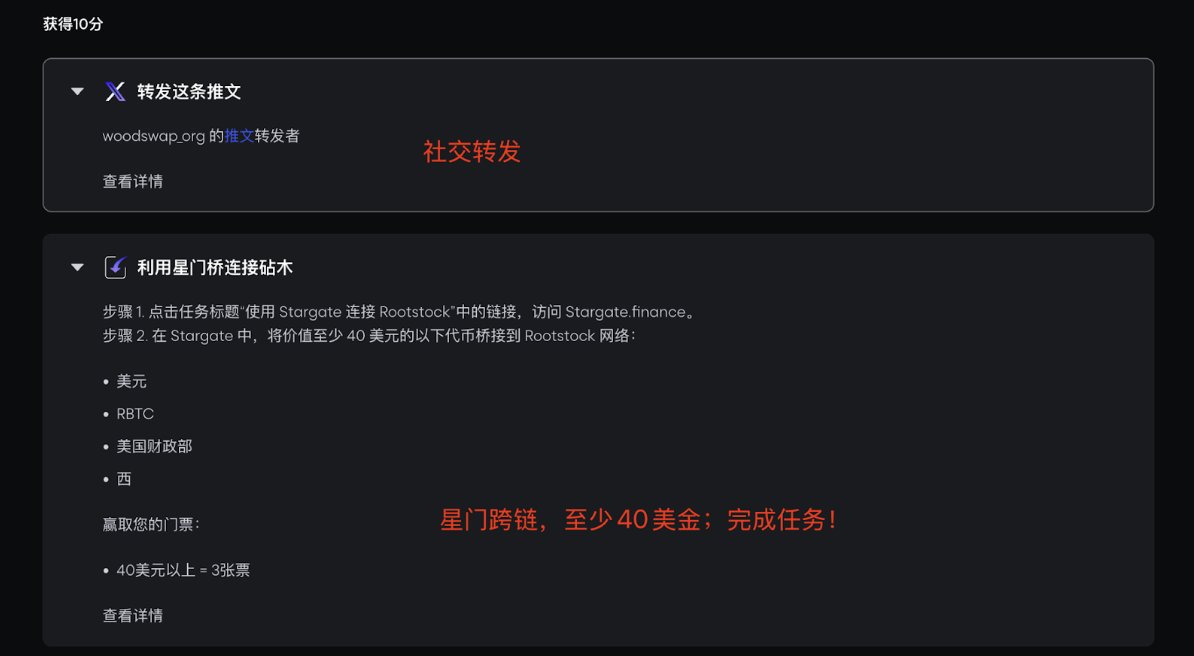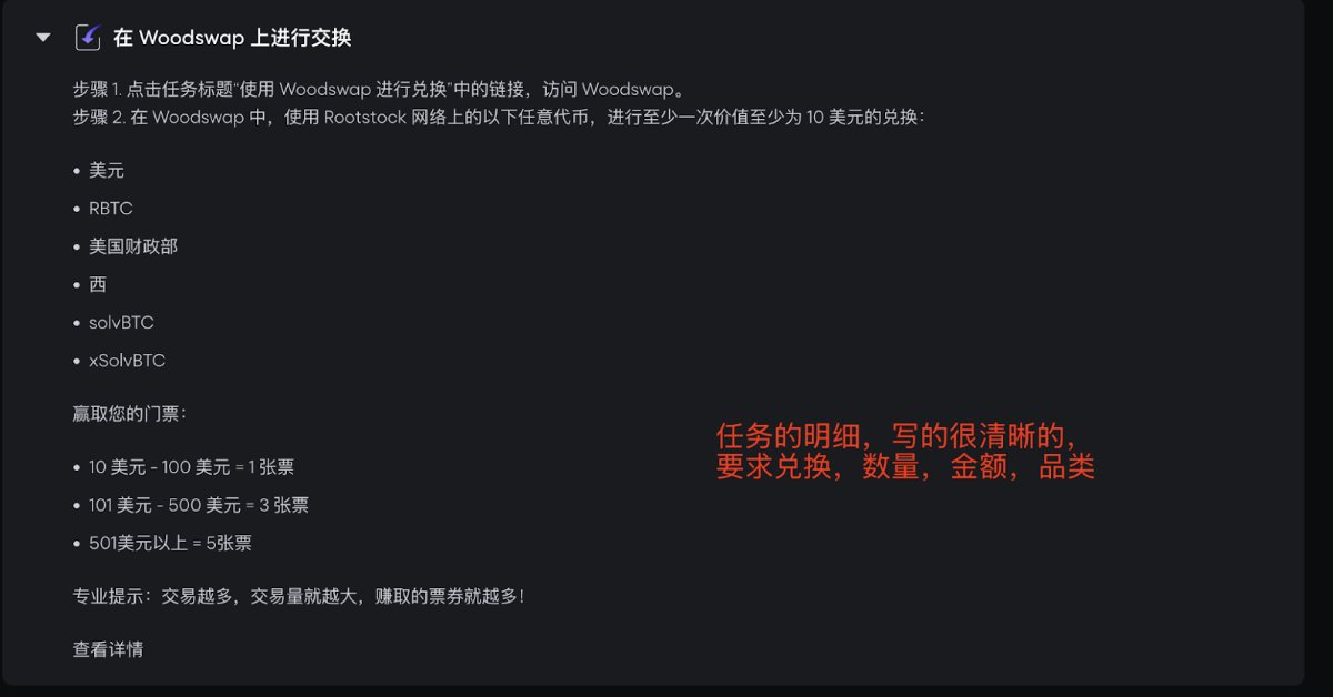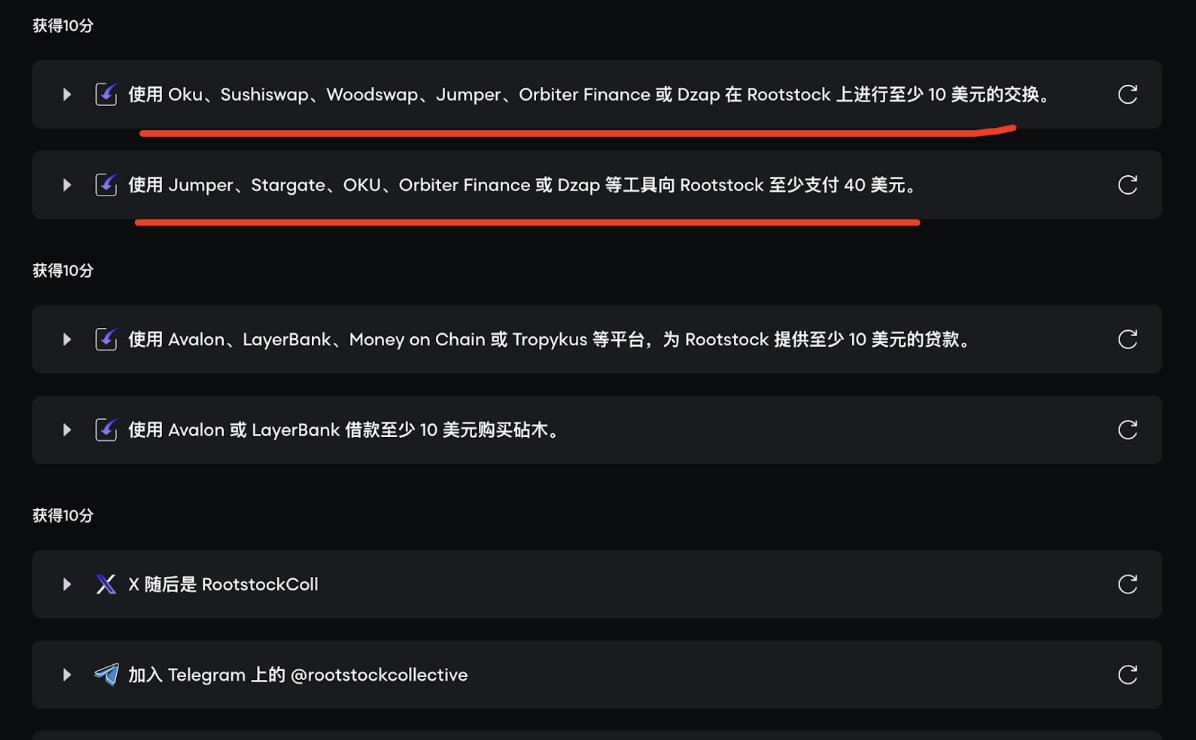 Rootstock第4赛季交互教程(后附详细说明) https://t.co/oiURXTTEIC 很多人知道BTC的储值,但其在原生层面无法真正流动,赚取收益或参与应用交互,今天讲一个可能改变BTC生态格局的项目@rootstock_io——比特币上首个智能合约Layer2(这个项目关注的大佬特别多) 怎么理解打个比喻 想象比特币是座孤岛,Rootstock就是连接外界的跨海大桥,它通过“Layer2”技术,让BTC瞬间变身成RBTC,直接参与借贷、交易、流动性挖矿等DeFi,从而能解锁BTC蕴藏的巨大生产力 Rootstock拥有最完整的一套比特币DeFi原语,这就是它的厉害之处——能解锁BTC生态价值 BTC本身不具备智能合约功能,导致其生态发展受限,而Rootstock通过“合并挖矿”技术,将比特币的安全性(87%算力保护)与EVM兼容技术,也把以太坊的智能合约带到比特币身上,成为比特币的DeFi层 看看Rootstock优势到底有何硬核之处 原生比特币DeFi——把BTC变成可编程的rBTC(1:1锚定原生BTC)直接参与借贷、交易、赚收益,不用卖币 超低Gas费——最近升级后手续费狂降60%,经常链上交互对GAS很敏感的 安全天花板——由Foundry,AntPool,Binance Pool等顶级矿池守护,比以太坊还稳 跨链超能力——通过LayerZero,ETH、BNB、Arbitrum的资产秒传比特币世界 与EVM兼容性超强——已于uniswp,SushiSwap,LayerBank,Solv等近120个应用集成通过Rootstock随时可参与其中 如果说Rootstock是一辆车,那代币 $RIF 就是让车跑起来的汽油 项目核心代币RIF ——加速推进BTC生态的燃料 (已上线Binance等交易所) RIF被设计用来加速基于Rootstock的比特币DeFi采用 RIF的关键三个作用: 1️⃣ 治理神器:质押RIF当“议员”,投票决定生态基金怎么花,还能抽空投 2️⃣ 印钞机玩法:存RIF挖stRIF,年化收益冲到33%(是的你没看错) 3️⃣ 通行证特权:买USDRIF(1:1锚定美元)、自定义钱包名(比如alice.rsk) RIF代币治理是其最重要一环 与RIF直接关联的DAO——Rootstock Collective这是Rootstock社区的核心组织——用投票权决定生态未来的发展方向 通过Rootstock体验Bitcoin DeFi赢取50万美元奖励,银河Golden Sats挑战赛最后一季比较重要的 即日起至12月15日,完成跨链、借贷、流动性挖矿等任务,即可赢取: - 2个Lil Pudgy NFT(限量盲盒,社区爆款) - 超19万美元APY加成奖励(交易量越高,奖励倍数越大) - 未中奖票券兑换RIF代币(最低15枚起兑) https://t.co/oiURXTTEIC 银河任务指南教程 整个系列任务页面指示非常清晰,通过流程点击相关提示链接即可进入相关app完成任务 第一项任务奖励10张门票 - 跨链至少40U至Rootstock 打开此任务栏后点击使用我们平时常用的Jumper,Stargate或者Orbiter Finance完成即可比较简单 - 在Rootstock完成至少10U的兑换 -刚才跨到Rootstock的代币,其中的至少价值10U的任意代币兑换成 rBTC或USDT即可 一样的方法使用我们常用的比如Sushiswap直接兑换即可 第二项任务奖励10张门票 - 在Rootstock提供至少10U的存款 通过Avalon、LayerBank等存入20U相关资产(等下需要借出10U,所以需要多存一点当抵押品) - 从刚才存入代币的协议,借出至少10U即可完成 第三项任务奖励10张门票 - 兑换至少40U $RIF 代币,然后全部质押到 Rootstock Collective https://t.co/hLj7XMS78V - 关注@RootstockColl并加入官方TG https://t.co/0r7GMKlFMy 最后一项任务奖励15张门票 - 进入Money on Chain或Tropykus存入至少10U - 使用Avalon 或 LayerBank上进行循环借贷至少10U - 铸造RNS域名(至少持有域名2年,要完成需要5个$RIF)https://t.co/hQtRZAc5g2 本文不构成投资建议,市场有风险入市需谨慎,请自行研究(#DYOR)