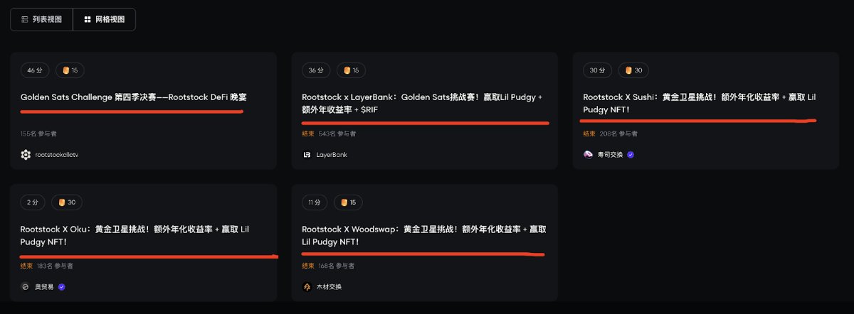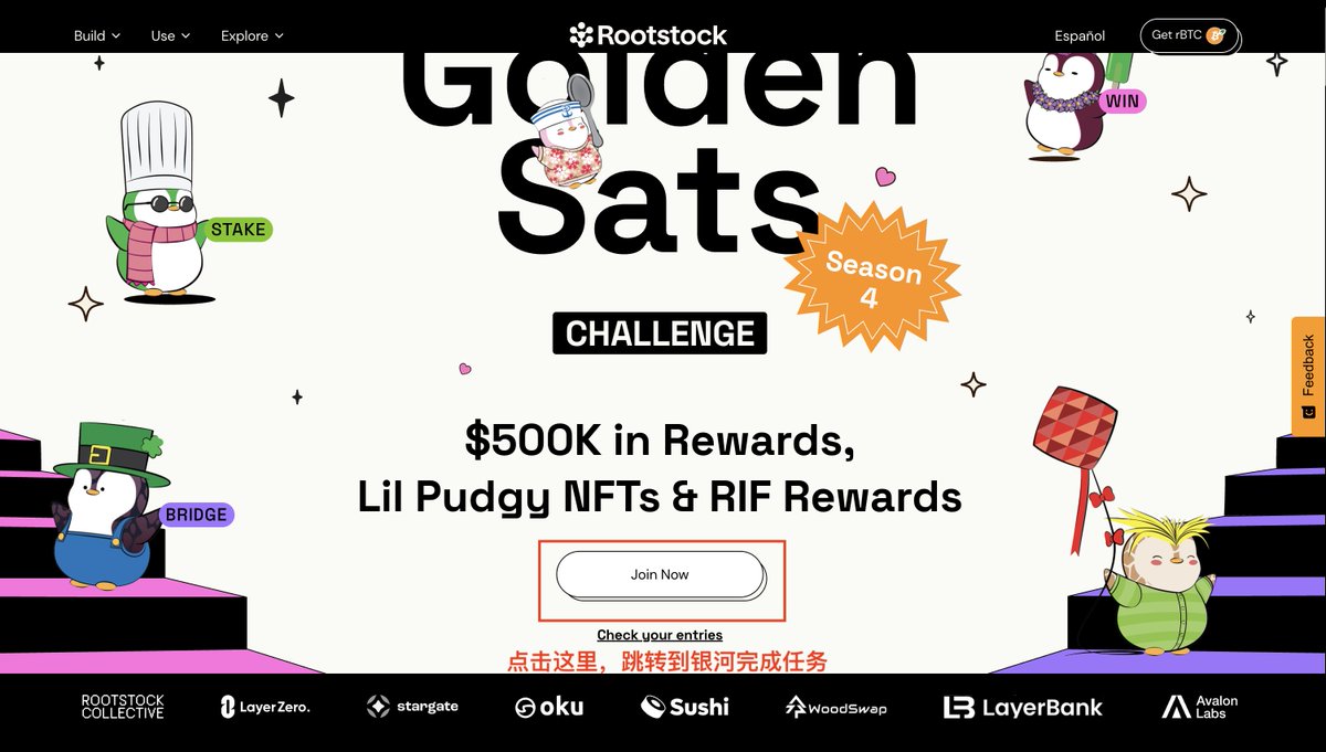 大家都知道比特币是“数字黄金”,但绝大多数 BTC 都躺在钱包里睡大觉——没有收益,无法参与生态,更别说流动性了。 比特币其实可以“醒过来”: ✅ 赚取收益 ✅ 参与借贷 ✅ 提供流动性 ✅ 自由跨链流通 有一个 Rootstock —— 建立比特币原生的 DeFi 层之上可以盘活。@rootstock_io是比特币生态上第一个也是最领先的DeFi Layer,2018 年主网上线,可以说完美集成了比特币的安全性 + 以太坊的可编程性,是最易用、最安全、最去中心化的解决方案。其代币RIF也在主网上线后不久正式发行,肩负探索BTC生态更多可能性的重任,当然,对用户来说,单单就质押RIF获取BTC收益这一点就足够吸引人了! Rootstock亮点: 1、它由比特币真实矿工保护(87%+算力) 2、完全兼容 EVM,生态丰富(Sushi、Uniswap、LayerBank…) 3、近期升级后 Gas 费用大降 60% Golden Sats 第 4 赛季现已开启!(11月3日 - 12月15日),本赛季是Golden Sats 活动的最后一季,重点奖励为:2 个 Lil Pudgy 抽奖名额以及 $RIF 兑换奖励 任务如下: 1、完成跨链、兑换、借贷等任务,收集门票 2、门票可参与抽选 Lil Pudgy NFT,或兑换 $RIF 代币 3、总奖池超过 $19万,还有限量连帽衫; 👉 任务指南:https://t.co/eF0hT5OzFi 👉 参与链接:https://t.co/a8akHZ1BTB 银河上有五个积分任务: 1、Golden Sats Challenge 第四季决赛; 2、Rootstock x LayerBank:Golden Sats挑战赛!赢取Lil Pudgy + 额外年收益率 + $RIF; 3、Rootstock X Sushi:黄金卫星挑战!额外年化收益率 + 赢取 Lil Pudgy NFT! 4、Rootstock X Oku:黄金卫星挑战!额外年化收益率 + 赢取 Lil Pudgy NFT! 5、Rootstock X Woodswap:黄金卫星挑战!额外年化收益率 + 赢取 Lil Pudgy NFT! 总体任务主要是:社交任务,跨链、Swap、借贷、流动性; 每个任务都有要求和资金明示,完全任务之后刷新,即可完成积分领取; 整个任务都不是很卷,都只有几百人参与; (不构成投资建议,请自行研究,DeFi 有风险,参与需谨慎。)