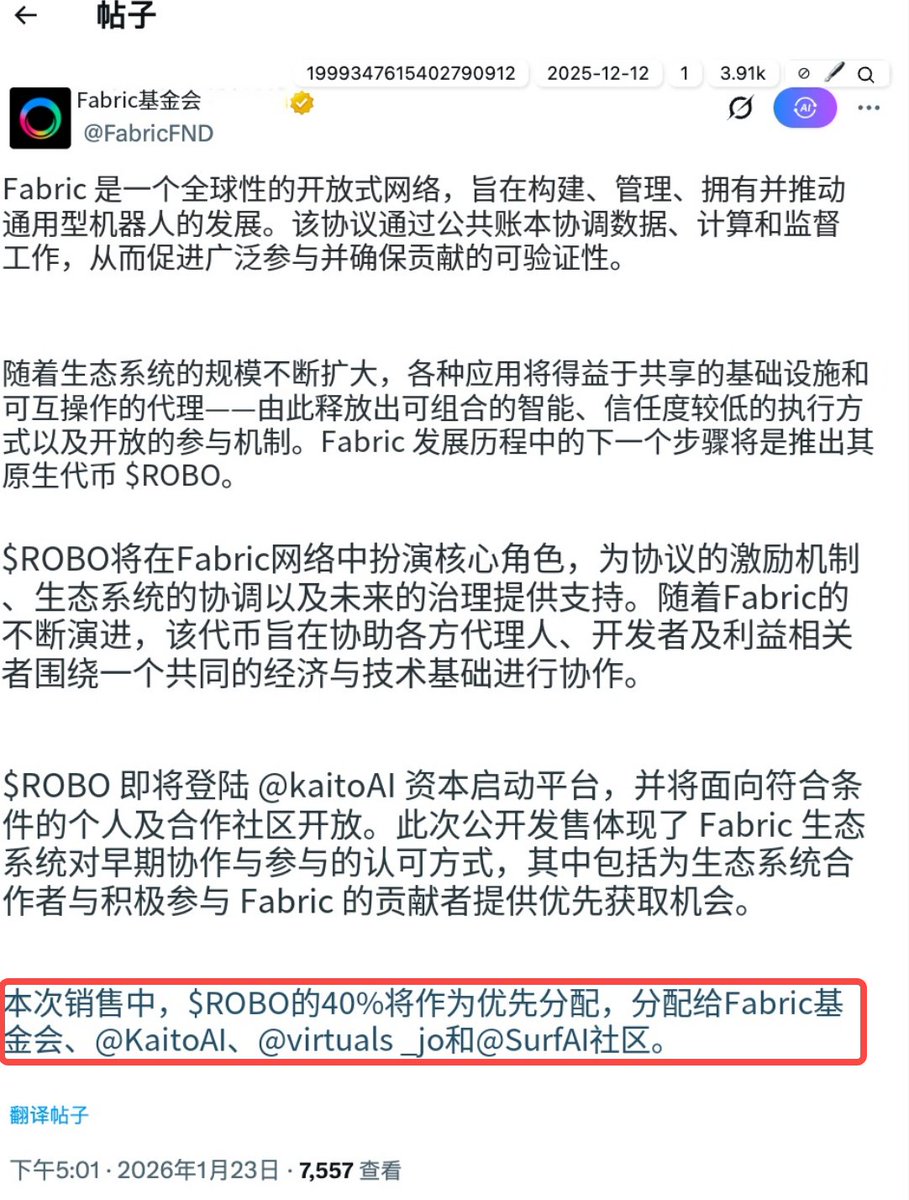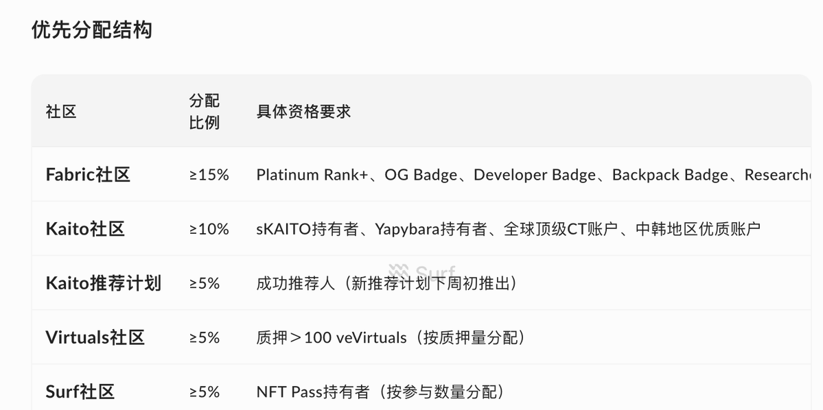 @FabricFND 在kaito的打新,40%的代币会优先分配给 @KaitoAI @virtuals_io 和 @SurfAI 社区。