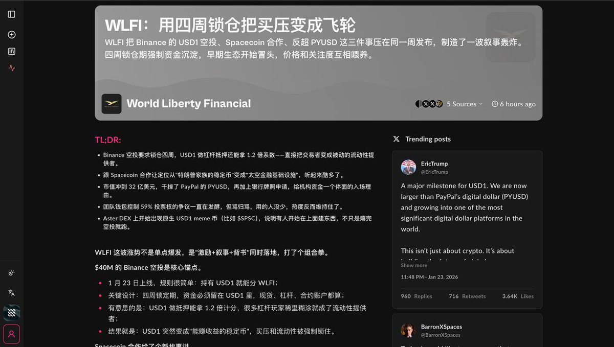 最实用的是 Crypto Pulse 功能,实时动态监控大量 X 账号,相当于降噪器筛选有价值的信息,比如我看到这篇《WLFI:用四周锁仓把买压变成飞轮》,它对币安 x WLFI 存 USD1 的活动做了更广更深的分析,让我对 USD1 的持币信心更足。
