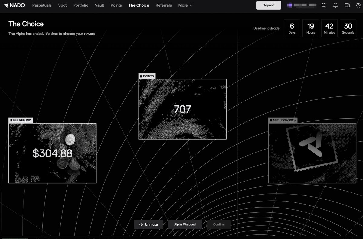 Nado一大早可以选NFT,错过了,起来就晚了,现在只要有选择拿积分了。 这个号拿了700多积分,显示亏了1000多刀。 我刷Perps基本都是亏手续费的,羡慕高手们是赚钱。手续费是其中之一,其实最重要的是滑点,大部分买进去的时候就开始亏,nado的价格波动太大了。 就算我开对冲,其实还是有磨损,两个平台的跨对冲,一边赚一遍亏,这个我每次在开的时候整体算下来,价差也是亏的。 现在后台邀请没刷过交易额的可以删除,这个邀请还可以继续用 https://t.co/gu0RQ4K8ZR