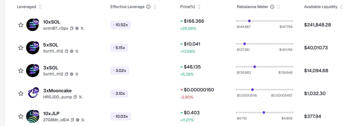 这些杠杆代币和普通现货一样交易,自带固定杠杆,比如5XSOL代币,涨跌幅度是SOL的5倍。它靠链上的“杠杆池”和“融资池”实现杠杆,价格波动到阈值就自动再平衡,用户只管持有代币,不用盯盘追加保证金,想短期放大收益、抓趋势的话,直接买就行,剩下的全交给协议搞定,操作起来超简单。传统金融早就有这类结构性产品(比如3倍纳斯达克ETF),但Mooncake直接把整套流程搬上链,去掉所有中介,让杠杆交易变得透明又高效。