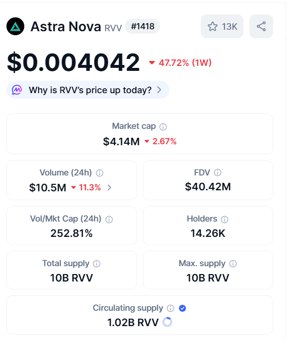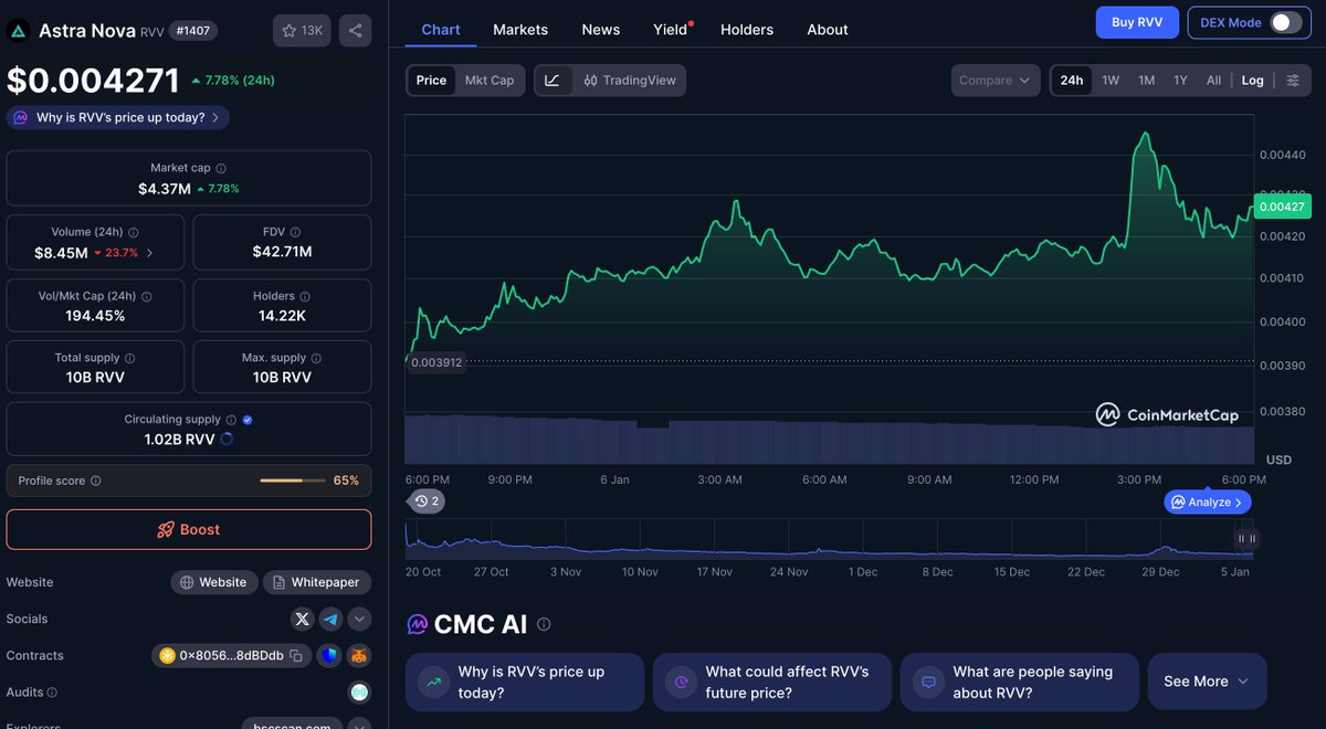 $RVV 今天成为热点主要源于项目方 Astra Nova 高调宣布已完成大规模代币回购计划,累计回购超过 6.6 亿枚代币(占总流通量的约 42%),并公开了链上钱包地址以供验证。这一举措直接减少了市场流通量,增强了市场信心,此前已推动代币价格短期内大幅上涨。同时,项目方承诺将这部分代币锁定 6 个月,并计划将其用于未来的合作与生态发展,结合公开透明的操作,共同刺激了市场的关注和交易活跃度。