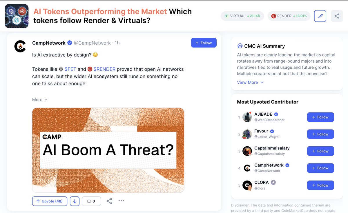 🔥 TOPIC OF THE DAY AI tokens are quietly outperforming the market while most eyes are elsewhere. $RENDER and $VIRTUAL already moved. Creators are sharing picks, conviction levels, and early signals on "which one moves next?" Don’t miss the alpha 👇