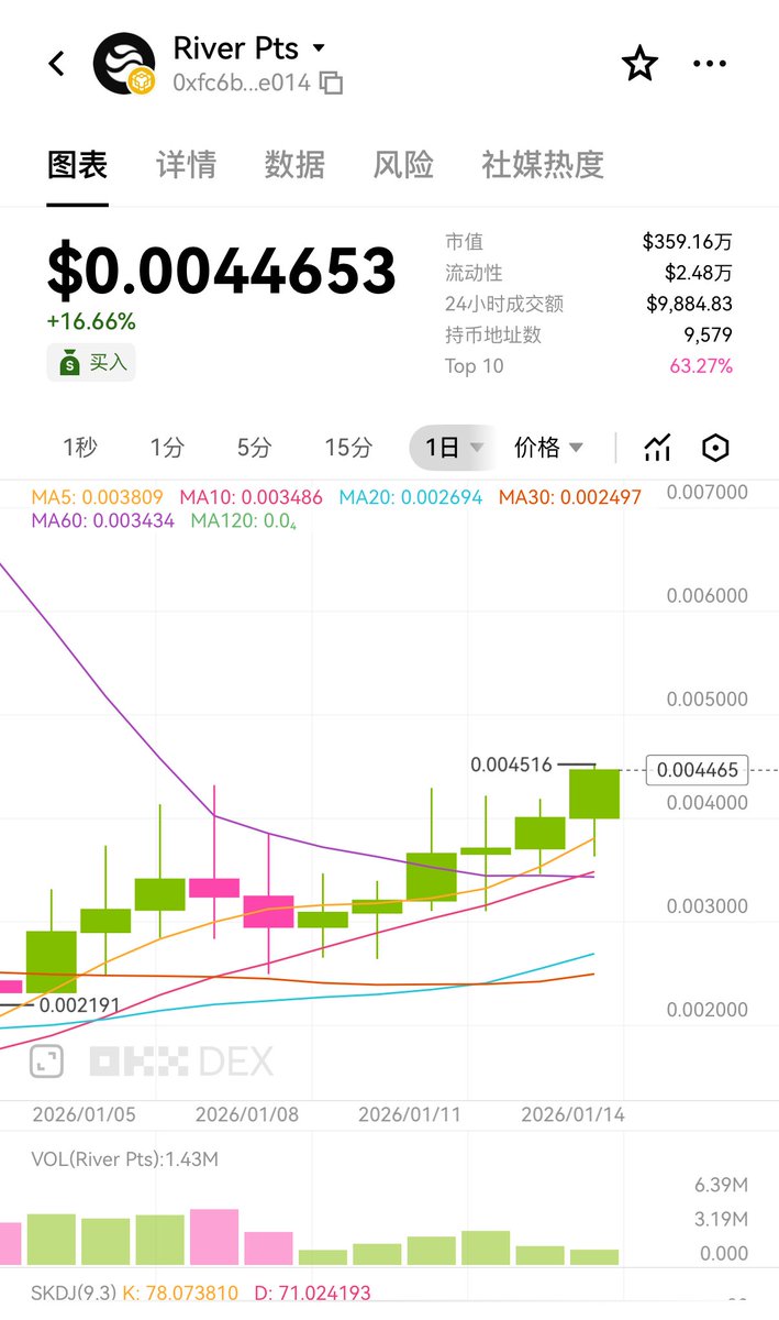 River 自从上线以来,表现非常猛,币价最高涨到10U 左右,币价上涨超5倍,这个还不算什么,它的积分 River Pts 最高上涨 43倍,俩个代币之间的互补成就了币价的螺旋上升,飞轮效应真的太猛了。这个我是真有,但我卖大飞了,大腿已经拍肿好几次了!