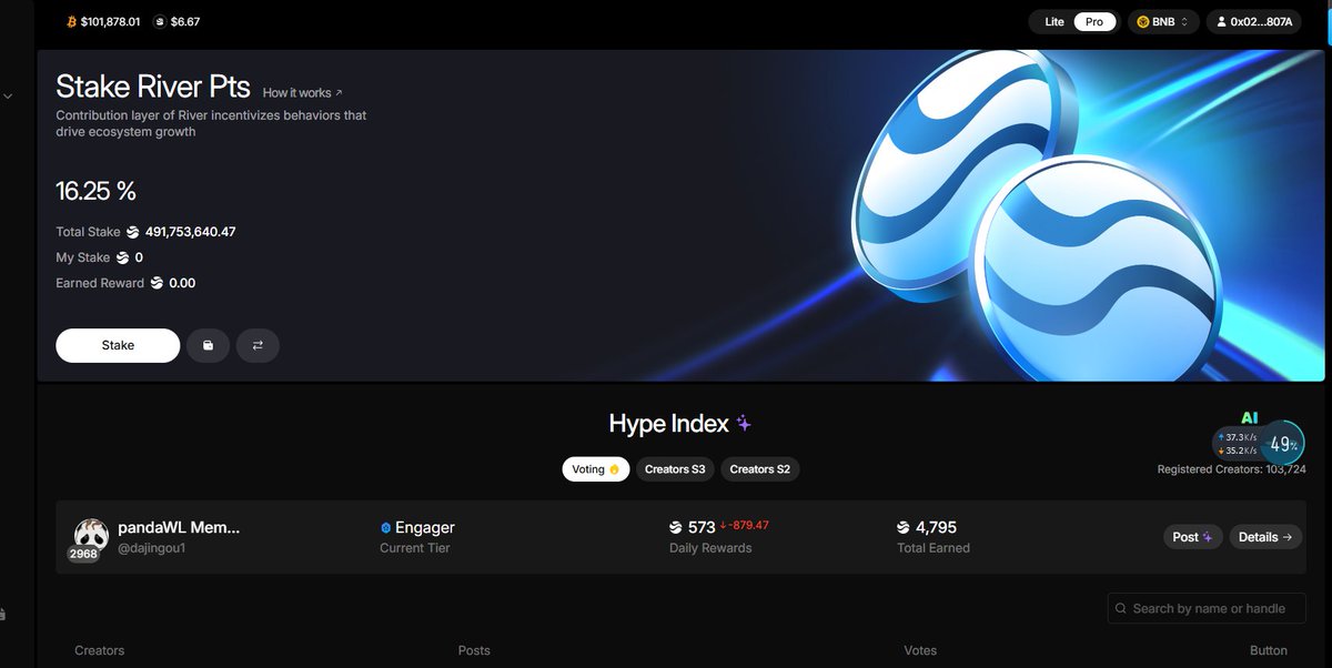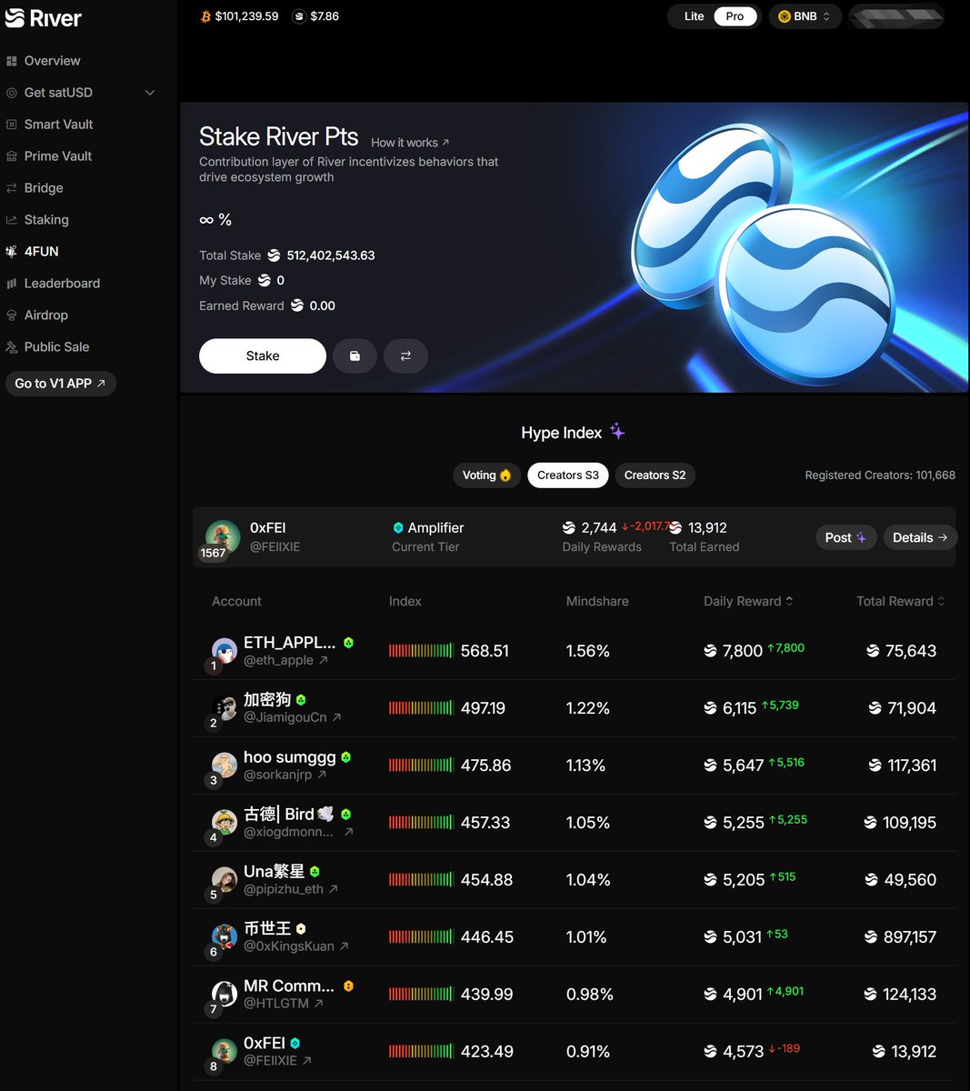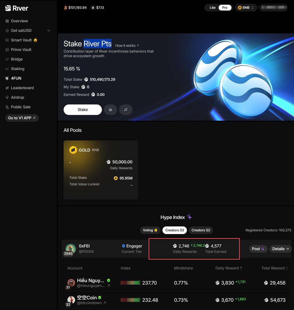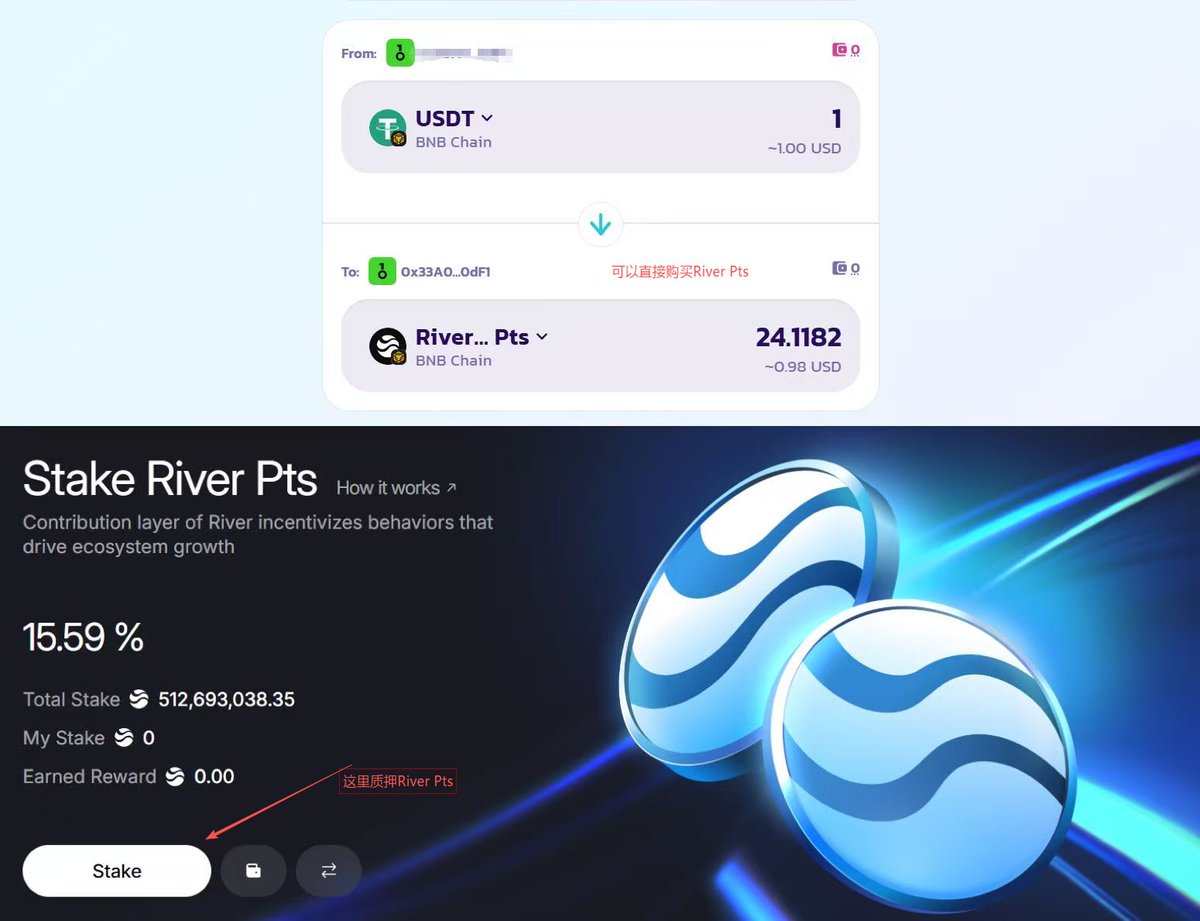 这些 Pts 后面可以拿去质押赚收益,或者兑换成 $RIVER ,最高有 27 倍奖励。