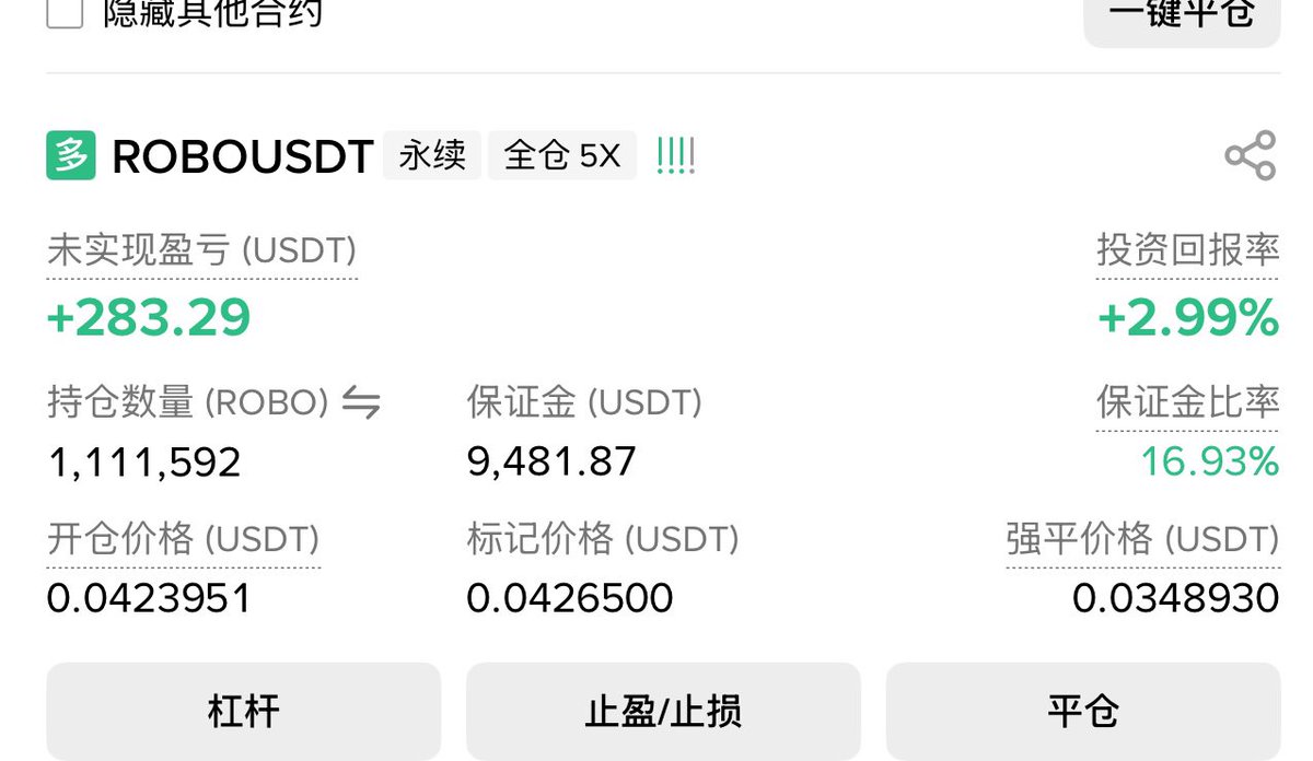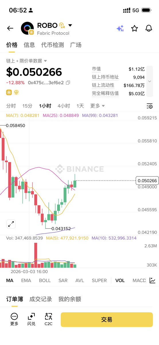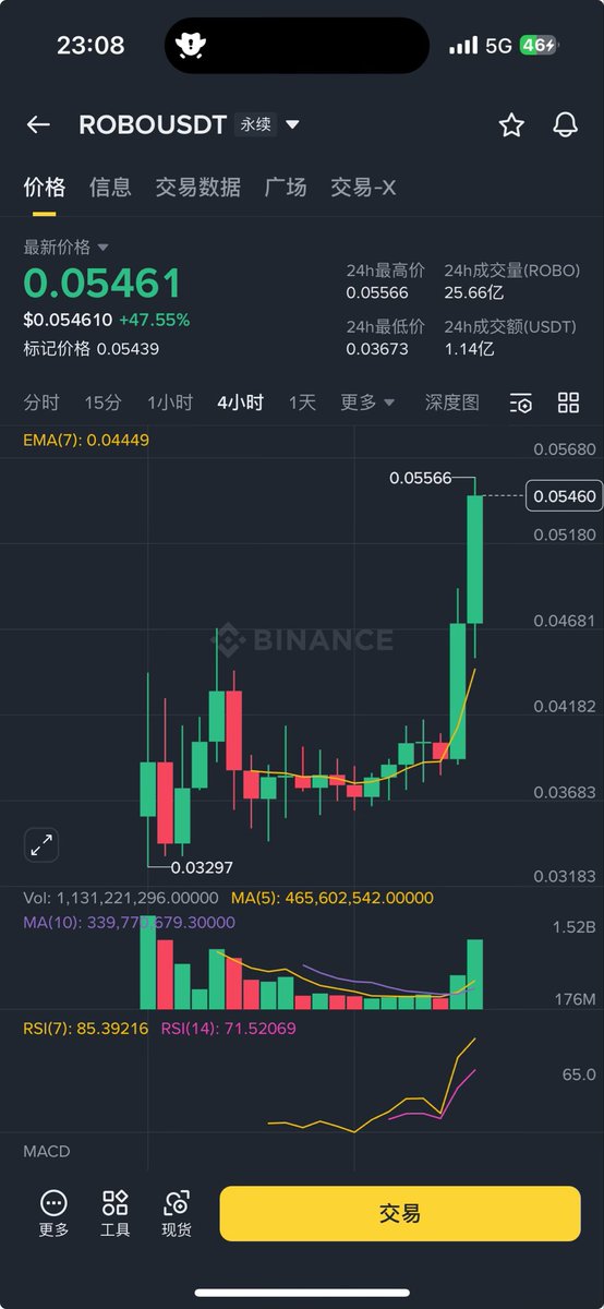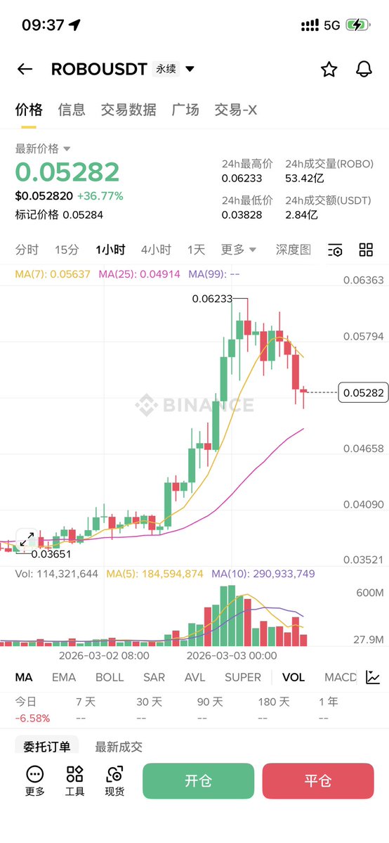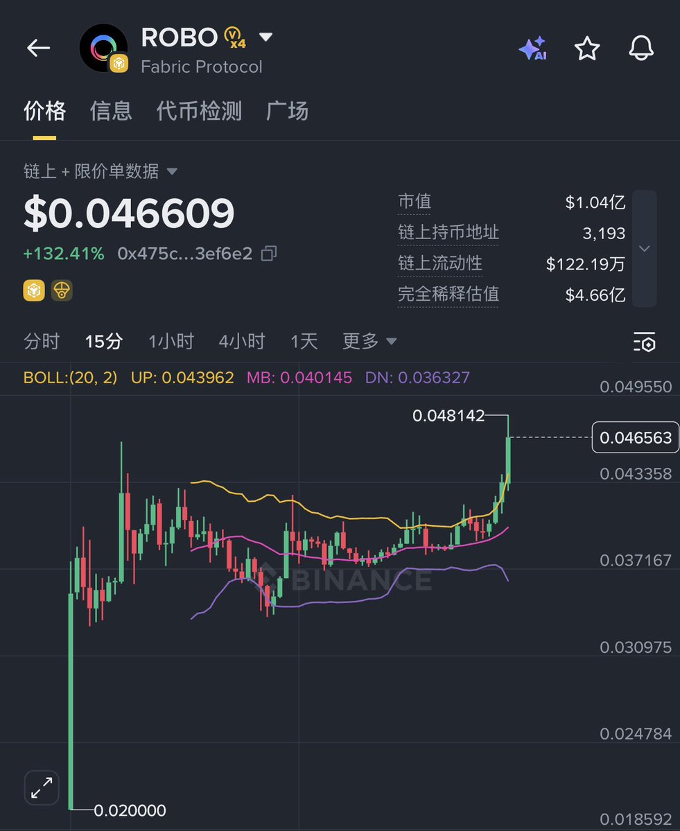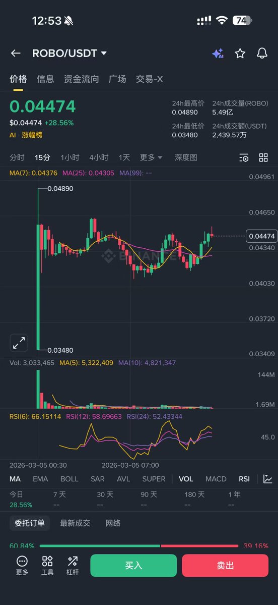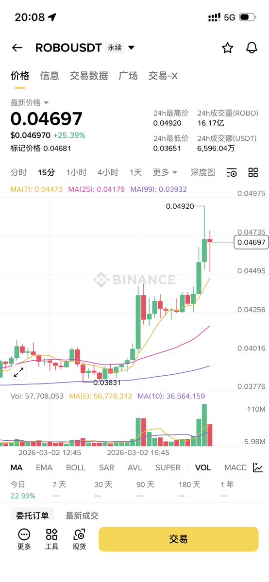 果然没看错! $ROBO 不仅站回了0.04,刚才还冲到了接近0.05的位置! 现货供应不足,回调都是吸引期货空头的… 我把最后50w枚也出掉了,真没想到在这个熊市大背景下,打新居然还是赚的! 事实证明,只要项目方是正经的,二级市场表现就不会太差!