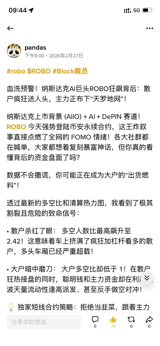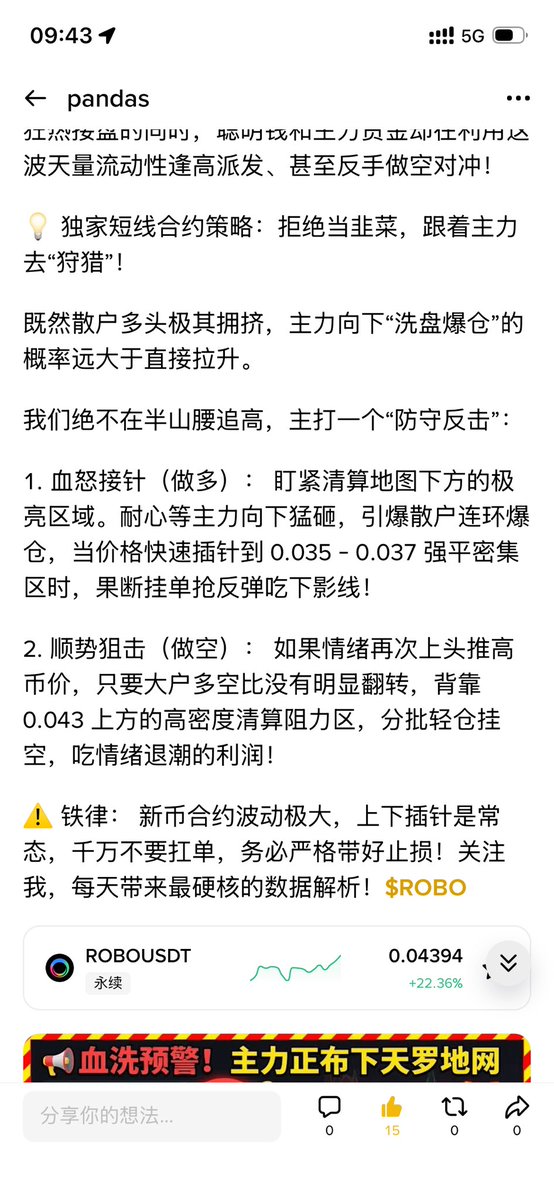 $ROBO #BTC #ETH 全网封神!提款机级精准狙击!史诗大反转,跟上这波“血怒接针”的都赚麻了! 昨天的全网,无数散户被 的上市叙事冲昏了头脑,疯狂加杠杆追高。 但全网只有我,敢在狂热中浇下最冷的水,顶着骂声直接公开预警:“别送人头了,主力正在布下天罗地网!” 数据不会撒谎,盘面就是我的印钞机! 回顾我昨天提前发布的【独家短线策略】:通过极其割裂的多空比(散户多头超载2.42,大户却在暗中做空),我明确指出主力必定会向下血洗多头! 更是直接把财富密码喂到了你们嘴边——在 0.035 - 0.037 强平密集区,挂单死等“血怒接针”! 结果呢?睁大你们的眼睛看看今天的暴力 K 线!庄家就像是按着我的剧本在操盘! 极限插针到 0.03297 完美扫掉多头后,瞬间原地起飞,一路狂飙突破 0.04688,单日现货爆涨超 22%! 什么是庄家克星?什么是神级预判?这就是! 那些在半山腰凭感觉追高的韭菜,已经成了大户的“出货燃料”,尸骨无存。而听了我的话,在 0.035 附近精准抄底的铁粉,现在正躺着吃满一整根利润最丰厚的狂暴大阳线! 如果是 10 倍合约,直接就是 300% 的逆天收益,一夜翻本暴富! 在这个吃人的市场里,没有模棱两可的废话,只有招招致命的精确点位!多空比、清算热力图、主力资金流,在我眼里全是透明的明牌! 这波 $ROBO 的史诗级吃肉行情只是开胃菜。 你还要继续凭运气当韭菜,还是选择跟着真正的实力派去“狩猎庄家”? 立刻点击关注!锁定全网最硬核的数据解析与神级策略!下一个翻仓密码即将公布,别再错过财富自由的车门!