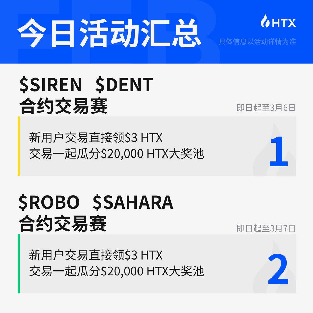 三月的第一天,搞点事情? HTX这期合约新币交易赛又上新了,SIREN、DENT、ROBO、SAHARA,四个币,两场比赛,总奖池加起来40000 USDT。 对平时就习惯做合约的老铁来说,这种活动属于“锦上添花”——反正每天都要看盘,顺手参与一下,多个博弈空间,何乐而不为? 这次活动有两个入口,别走错了: 👉 SIREN / DENT 合约交易赛: https://t.co/hV5scDb7fN 👉 ROBO / SAHARA 合约交易赛:https://t.co/MOyZOl97J2 玩法也简单直接:新用户和“潜水”老用户(就是很久没交易的那种)有5%的加成比例,交易额、收益额、收益率都算。新用户只要完成指定币对合约交易,最低交易额100 USDT,持仓至少2天≥30 USDT,就能拿3 USDT奖励,先到先得。 还有交易额奖励,最低交易额10000 USDT,按交易额瓜分奖池。 机会在,但风险更大。理性参与,别上头 @justinsuntron @HTX_Molly #HTXNovaPlus @HuobiGlobal @Ceee333_ @qingyang007 @xiaojiucai_andy @Xiaodu_HTX @HTX_community @DeerHTX @xiaxiarx @HTX_DAO #TRONEcoStar