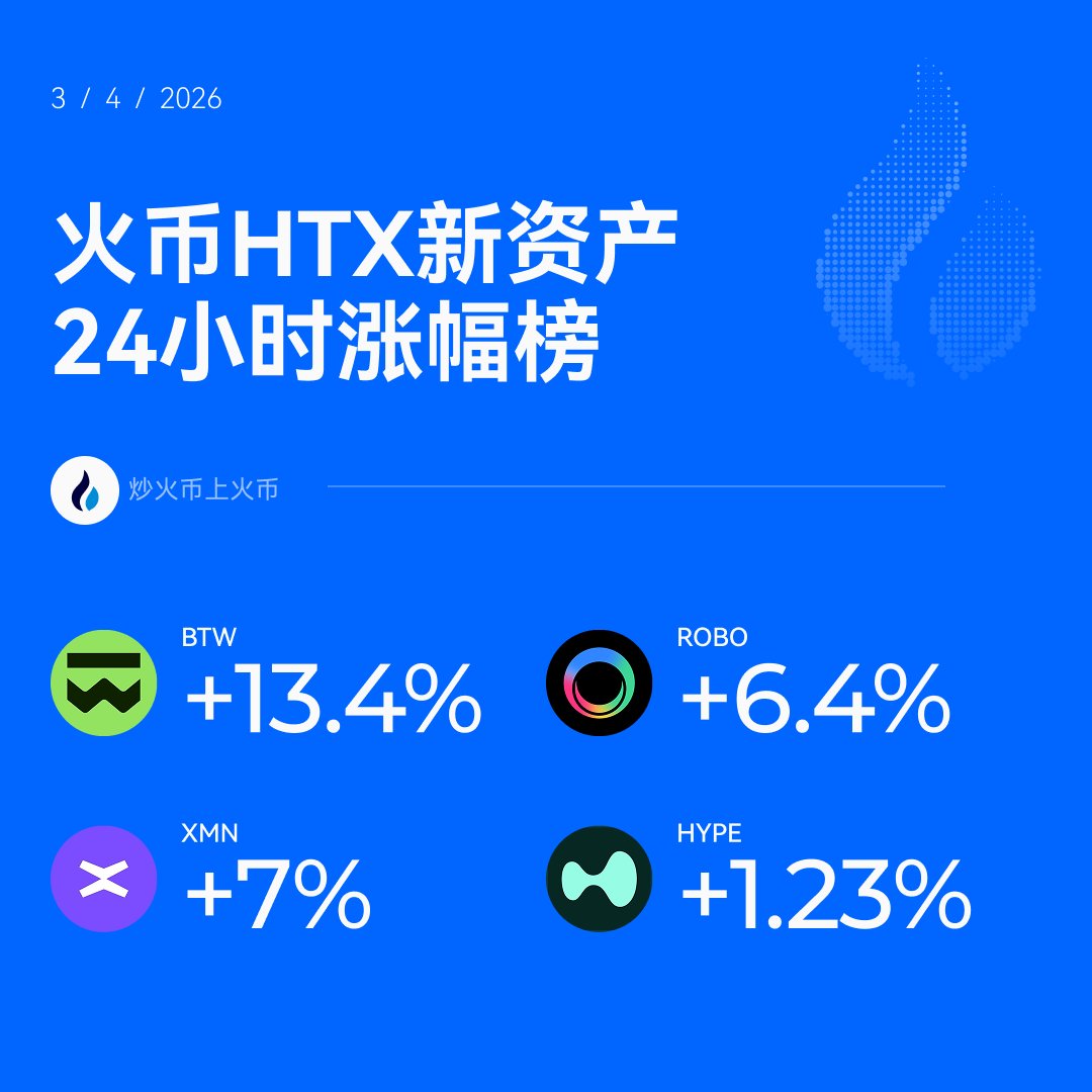 火币HTX新资产24h涨幅榜—— $BTW Bitway:专为比特币业务构建的Layer 1区块链,旨在支持比特币相关应用,于2026年3月2日上线交易,24h涨幅高达13.4%。 $ROBO Fabric Protocol:由Fabric Foundation开发,专注于AI和机器人技术,构建安全开放的未来,尤其针对智能机器从软件向现实世界的扩展,于2026年2月27日上线交易,24h涨幅高达6.4%。 $XMN xMoney:一种加密货币支付解决方案,旨在现代化金融和支付行业,提供即时交易和加密结算,解决传统支付痛点,于2026年2月25日上线交易,24h涨幅高达7%。 $HYPE Hyperliquid:高性能Layer 1区块链,从零优化设计,目标打造完全链上的开放金融系统,于2026年2月20日上线交易,24h涨幅1.23%。 这些代币均为火币近期新上市资产,表现依然可佳。历史不会骗人,也可回顾去年火币全年新资产表现💯 #上火币炒火币 #火币HTX