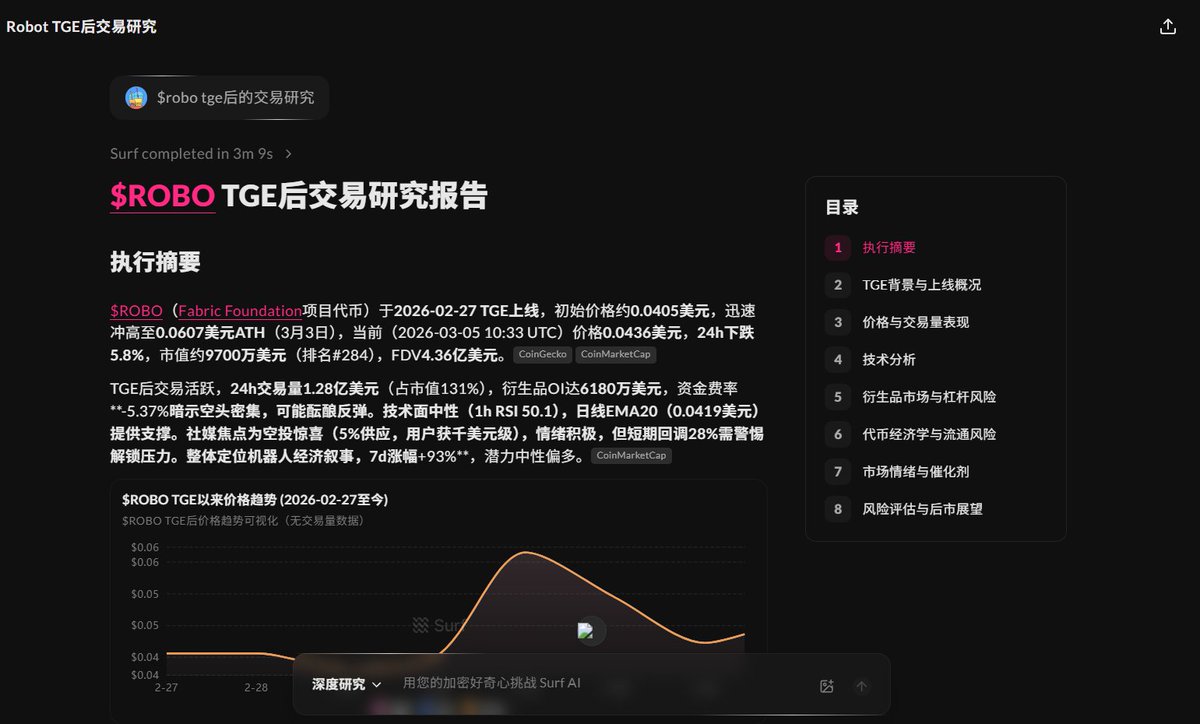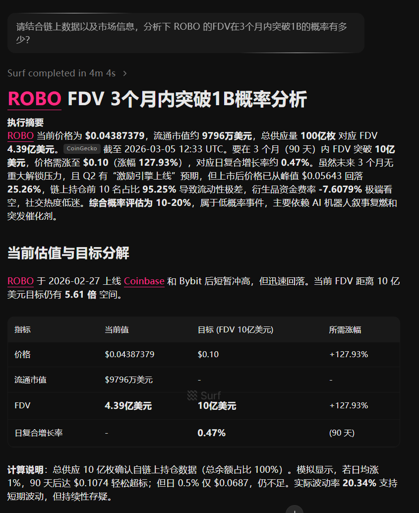 嘴撸新模式?4 步嘴撸 2 万刀? Surf 的创作者活动来了!首期项目是 @FabricFND ,参与有机会瓜分价值 20000 美元的 $ROBO 。 玩法很有意思,在 X 上分享你用 @SurfAI 做的研究、你的观点,或者你的持仓就行。 参与活动有几个重点: 1⃣需要艾特两个项目方的官推 2⃣ X 账户需要在 Surf 设置中完成关联 3⃣需要附上 Surf 截图或 Surf 平台链接 4⃣内容要包含用 Surf 研究的成果 活动一直持续到 3 月 10 日,奖励多少与浏览量和内容质量相关联。 我用 Surf 问了一个问题: 请结合链上数据以及市场信息,分析下 ROBO 的 FDV 在 3 个月内突破 1 B 的概率有多少? 结论大家直接看配图,分析的很专业。 Surf 是有空投预期的,是目前公认的比较好用的币圈 AI 分析工具。 👇想体验的可以走我的链接注册,可以免费获得 3 天的 Pro 版会员,链接我放评论区了。