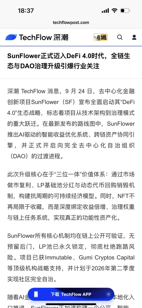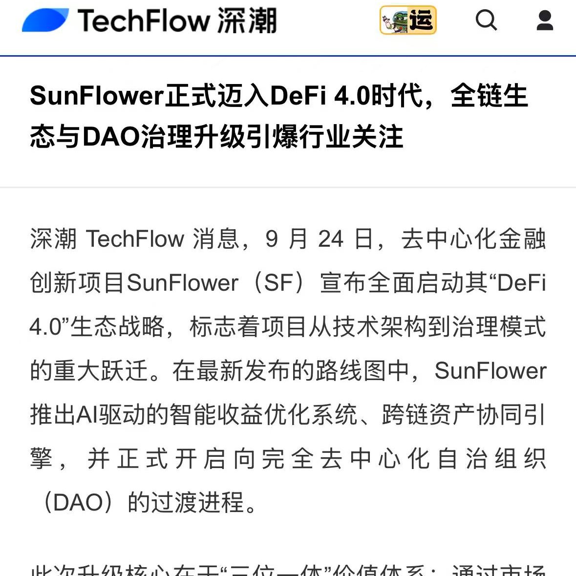 新的浪潮来临👉🏻@SunFlower_BSC| $SF 跟大家同步下SF的关键节点,它的DeFi 4.0生态要正式进入创世节点阶段*而且重头戏护花使者NFT今天15:00(UTC+8)全球同步预售🔽