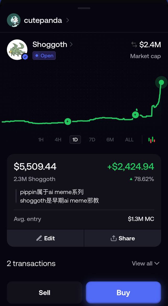 昨晚在 @tryfomo 的app上建仓了 $shoggoth 逻辑是跟pippin同样属于ai meme 这个shoggoth应该就是最早的ai邪教类型的了 平时我的仓位都放在fomo app上 可以直观看到 也会跟写大众点评一样往上面写评价