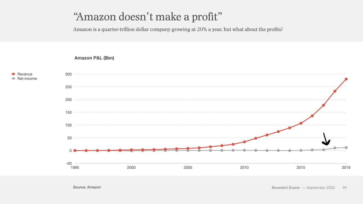 10 years of chop. All along the way, Amazon was beset with doubters and non-believers. Is e-commerce a VC-subsidized charity? They’re selling underpriced cheap low-quality knick-knacks to bargain hunters, who cares? How are they ever going to make actual money, like Walmart or GE?