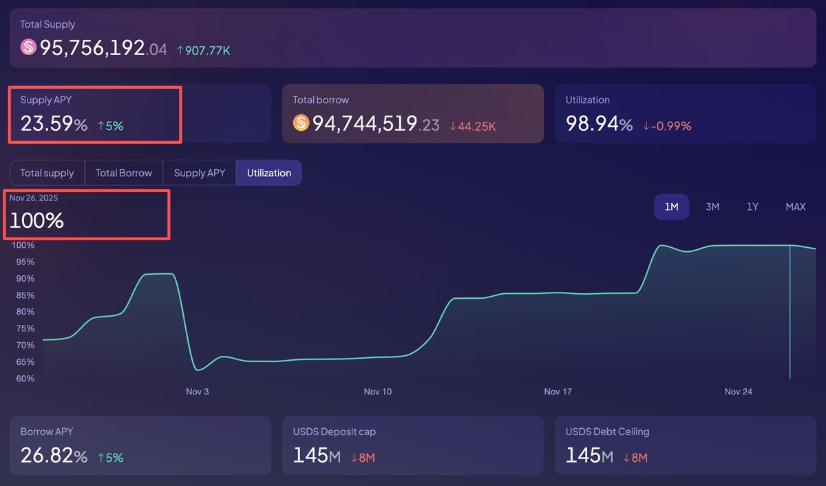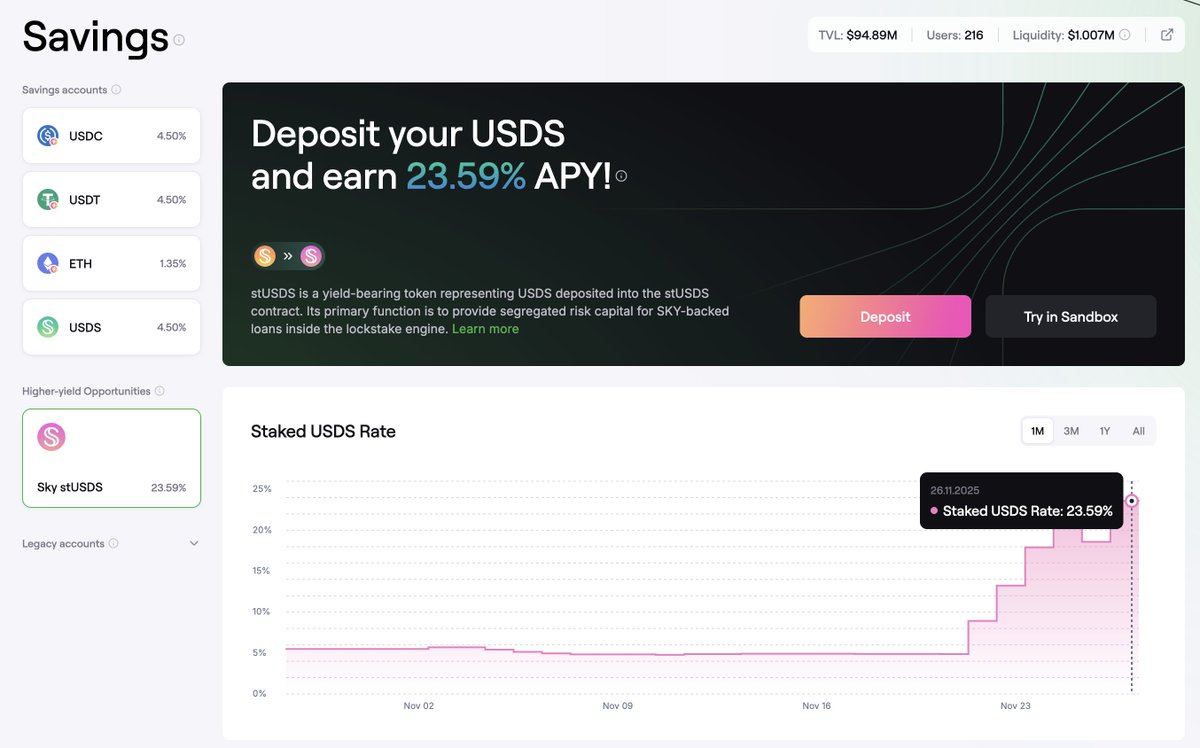 stUSDS的存款是给 $SKY 代币抵押借款的,风险等级最高,但在设计上与其他借贷市场隔离,初期LTV设置也很低,如果能接受这层风险,算是一个高息理财。