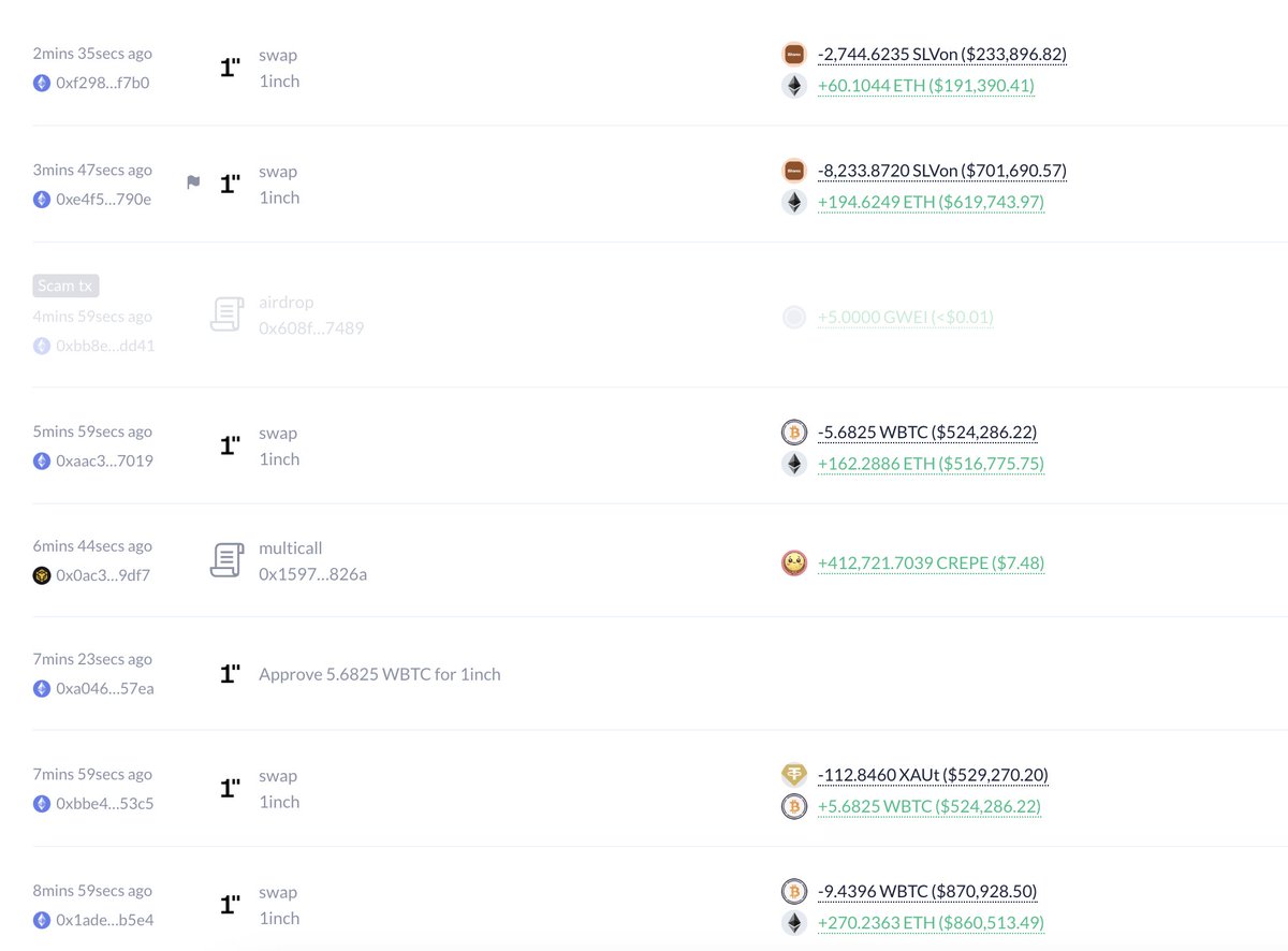 Gold just hit a new all-time high! Whale 0x4b6c swapped 326 $XAUT($1.53M) and 10,978 $SLVON($936K) for 724 $ETH($2.4M) over the past 30 minutes.