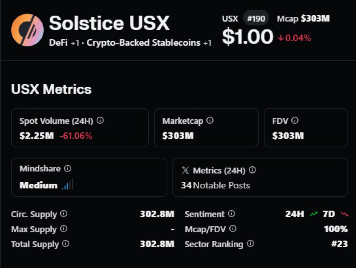 Solstice Finance 研报 官推:@solsticefi 项目介绍: Solstice是一个构建在 Solana 区块链上的机构级 DeFi 协议,专注于提供合成稳定币 USX 和收益型液体质押代币 eUSX。通过其 dApp,用户可以轻松访问资金费率套利和对冲质押策略的收益,同时保持资产的稳定性和流动性。项目于 2025 年 9 月底正式推出 USX,启动时 TVL 超过 1.6 亿美元,背靠 Deus X Capital 等机构支持。核心优势在于 delta-neutral(德尔塔中性)收益生成机制,过去 12 个月平均 APY 达 13.7%-21.5%,无代币通胀补贴。原生代币 SLX 采用社区优先分发模式,无 VC 私募,强调长期协议成功与社区激励对齐。当前(2025 年 10 月 10 日),项目 TVL 持续增长,7 天 APY 约 10%+,流动性池超过 2000 万美元。 背景与使命 Solstice Labs AG(Solstice 的开发实体)是 Deus X Enterprise 公司的一部分,与 Solstice Foundation 合作,旨在为链上时代重塑资产管理。项目于 2025 年 4 月宣布推出 USX,9 月 30 日正式上线,填补 Solana 生态中缺乏原生、收益型稳定币的市场空白。目前,Solana 上稳定币流通量占全球 5%(约 2380 亿美元中的 119 亿美元),但缺乏旗舰级 fiat-pegged 稳定币。 使命:民主化机构级收益机会,提供 Wall Street 级回报给 DeFi 用户,利用 Solana 的高吞吐量、低费用和快速最终性,实现无缝交易和全球支付 核心产品 USX:合成美元稳定币,100% 由 USDC 和 USDT 等稳定币抵押,支持多 oracle 定价。设计为可组合性强、透明度高,适用于借贷、交易和支付。 eUSX:收益型液体质押代币,通过 YieldVault 平台生成实时收益。用户可一键存入稳定币,访问 delta-neutral 策略(不受底层资产波动影响) YieldVault:核心收益引擎,利用链下资金费率套利和动态对冲质押策略。启动时承诺 TVL 1 亿美元,过去 3 年平均年化回报 19.2%(最近 12 个月 13.7%)。配备专用保险基金保护用户。 $SLX :原生实用代币,用于治理、激励和费用折扣。社区优先分发,无 VC 参与 团队与合作伙伴团队: 30+ 加密和 TradFi 资深人士,分布 10 个国家。核心成员来自 Solana Labs、Coinbase、Galaxy Digital、BlackRock、UBS 等。CEO Ben Nadareski 强调“DeFi 承诺:让所有稳定币用户捕获大协议独享的收益”。 合作伙伴:Deus X Capital(>10 亿美元 AUM,支持启动 TVL);Galaxy Digital、MEV Capital、Bitcoin Suisse、Auros;Arcanum Ventures(风险模型和 GTM);Chainlink、Jito、Raydium、Orca 感兴趣的小伙伴可自行研究 @xeetdotai