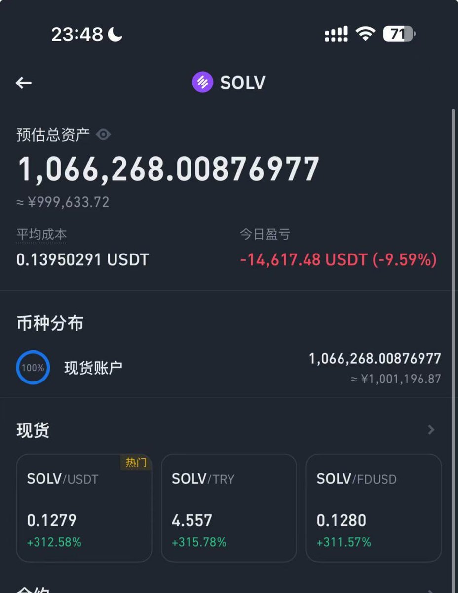 应该是去年的时候,一年来努力赚了点钱,手里有多余的资产了,所谓的「朋友消息」告知 $SOLV 上新后一定能涨,加上我自己也是头铁和傻逼兮兮研究了一下感觉市值还是有空间的,一开始买了点 $SOLV 现货,看跌了不甘心,又补了点多单。结果越跌越补,越补越亏...