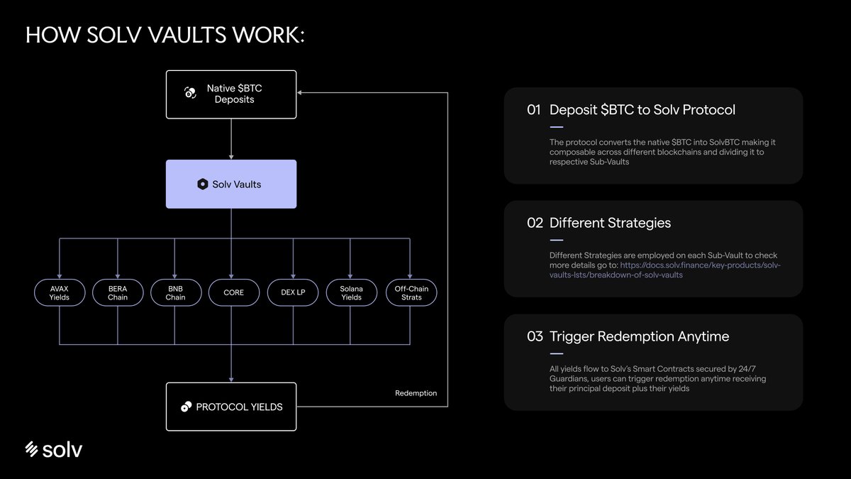 用户把原生 BTC 存入协议,系统会自动将其转换为 SolvBTC,并分配到多个子金库(Sub-Vault)中,用于不同链和策略的收益管理。