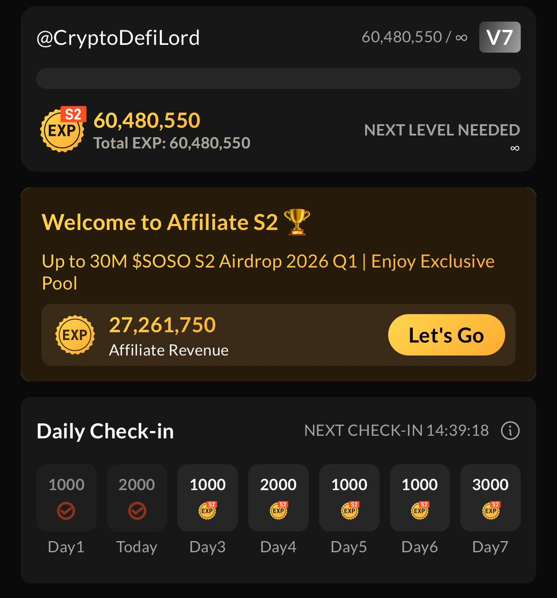 Go complete those time limited tasks now to stay positioned for the upcoming $SOSO S2 Airdrop.