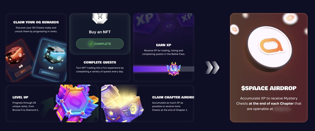 I got P5 with 1M xp now! I’d love to see an InfoFi-powered social layer land directly on @spaace_io . $Spaace Right now Spaace is already “trade-to-earn”. https://t.co/o6octmJdgx The next step could be “talk-to-earn for NFTs” — connecting InfoFi and the marketplace so that onchain actions + social mindshare are both part of the XP loop. Concrete idea: • On each collection / NFT page, add an InfoFi panel that: • surfaces X posts / threads / Spaces / articles about that NFT • shows a simple “Talk Meter” (how much this collection is being talked about across the market) • Let holders link their content (threads, memes, explainers, data posts) and reward extra XP / multipliers when: • their content drives traffic back to Spaace • their mentions / quote-tweets generate offers, listings or volume • Make it anti-spam by design: • weight XP by engagement + click-through to Spaace, not just raw post count • higher rewards for high-signal content (guides, explainers, real memes) vs. low-effort spam This would turn Spaace into a true InfoFi × NFT hub: • traders farm XP by using the marketplace • holders farm extra XP by talking about what they hold • collections can actively mobilize their community to boost both volume and mindshare on the same surface. In short: “Trade to earn + Talk to earn” on the same platform, with InfoFi fully plugged into Spaace’s XP and leaderboard system. @Buzz_spaace @Galileo_spaace @wallchain #Quacker @x__score