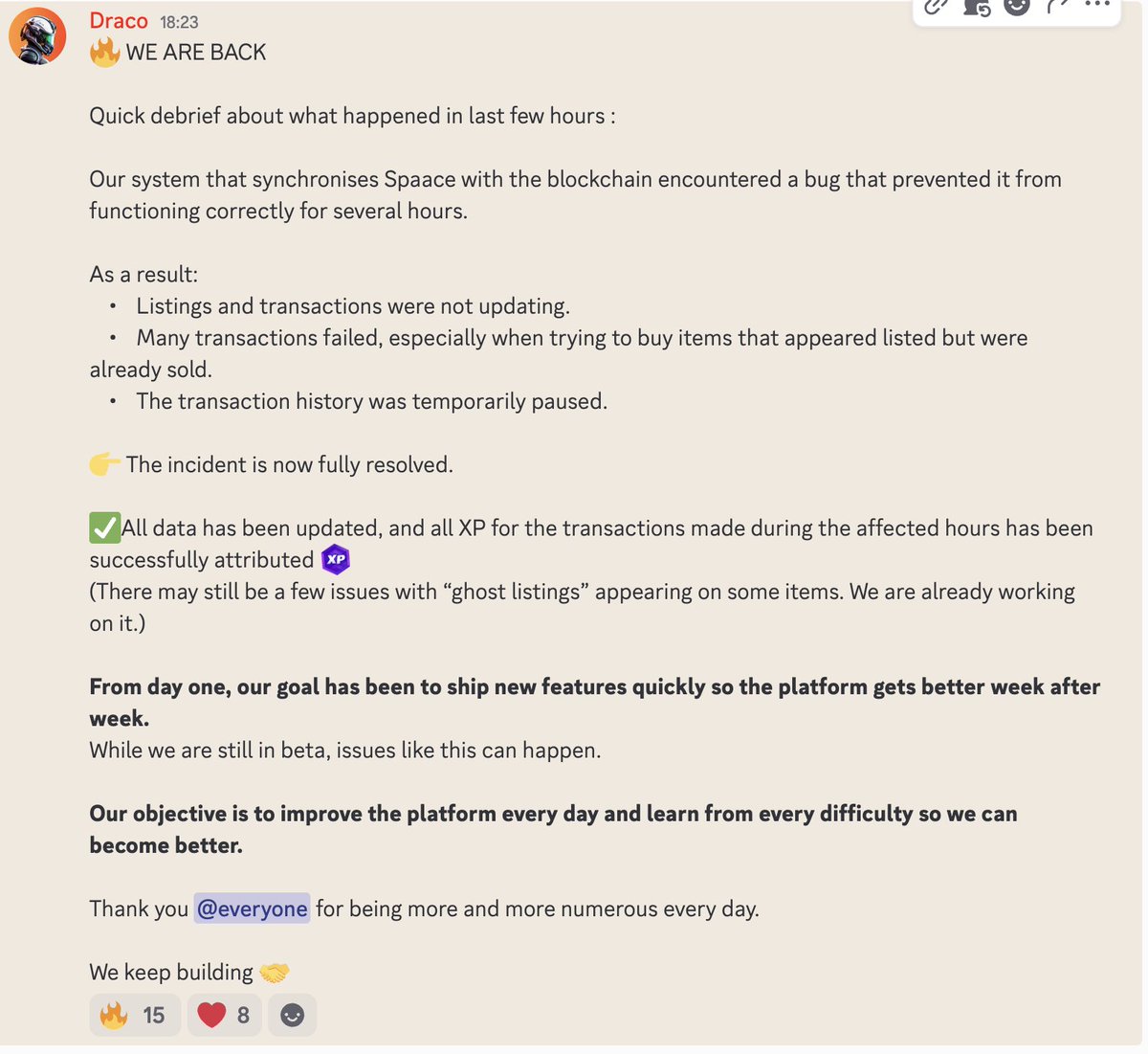No wonder I couldn’t farm any volume today — turns out the team was busy fixing bugs. @spaace_io And the @wallchain campaign ends in just 13 hours, time to push a bit more! Join in with me:https://t.co/o6octmJdgx Today’s Spaace on-chain sync incident really exposed both sides of an early-stage product. On one hand: listings weren’t syncing, transactions kept failing, ghost listings were everywhere — the user experience definitely took a hit. On the other hand: the team identified and fixed the issue quickly, restored XP, and shared a full debrief right away — which is actually pretty rare in Web3. Having issues in beta isn’t surprising. What matters is: 1. Can they provide real-time incident alerts + a status page so users don’t have to “discover bugs the hard way”? 2. Can they make core trading modules (listing sync / failure feedback / history) more robust than new features? In the next cycle, only the teams that can max out both “playability” and “reliability” at the same time deserve to call themselves a true Web3 entry point. For now, I’m taking note: teams that are willing to face problems head-on are worth keeping an eye on. #Web3 #NFT #Spaace $Spaace @Buzz_spaace @cookiedotfun
