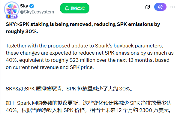 👉 Sky 减排行动:移除SKY质押中的SPK奖励,切断通胀出水口。