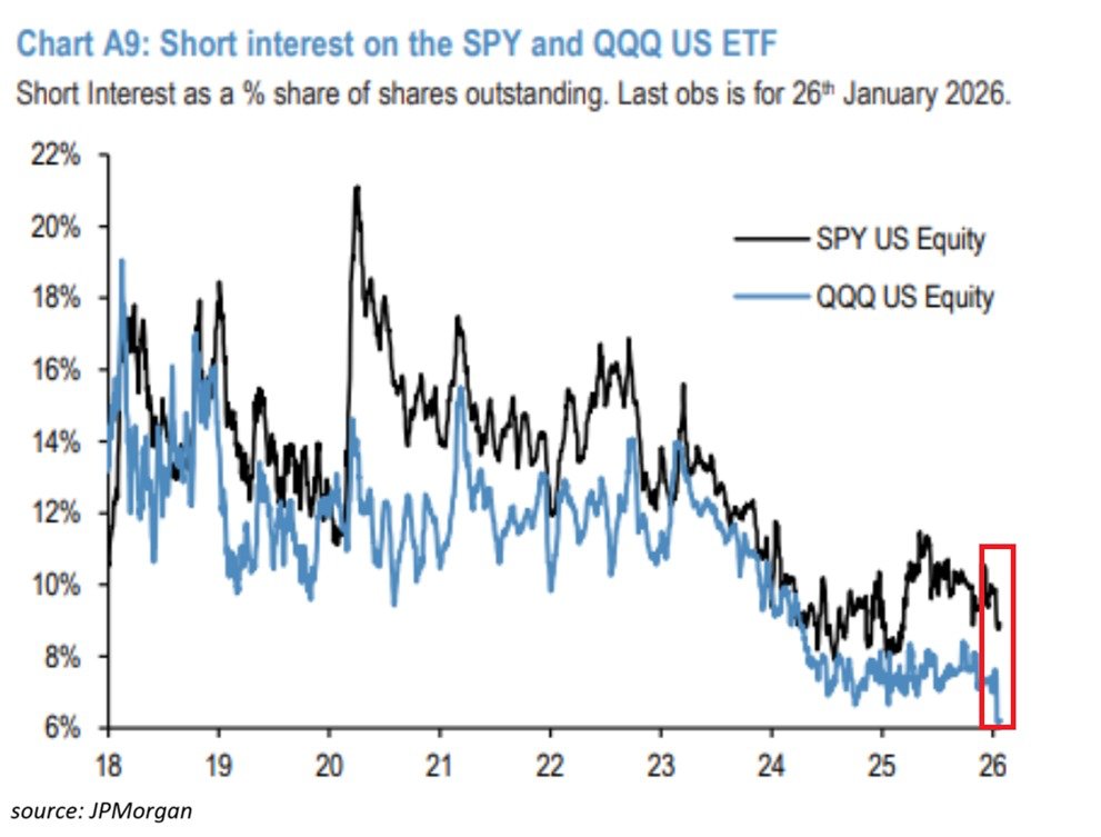此前美银1月基金经理调查报告基金手中的现金水平降至 3.2% 的历史新低(此前为3.3%),现在标普500ETF和纳斯达克100ETF的空头头寸已经降到了过去八年内的最低。多头子弹打的差不多了,空头也被干的七零八落。🤔